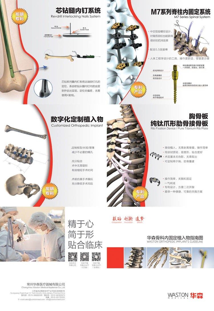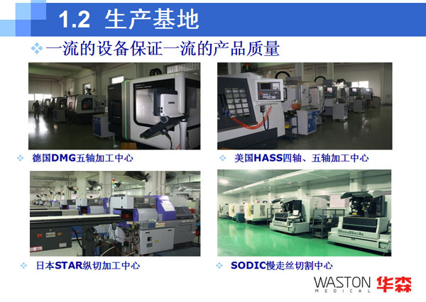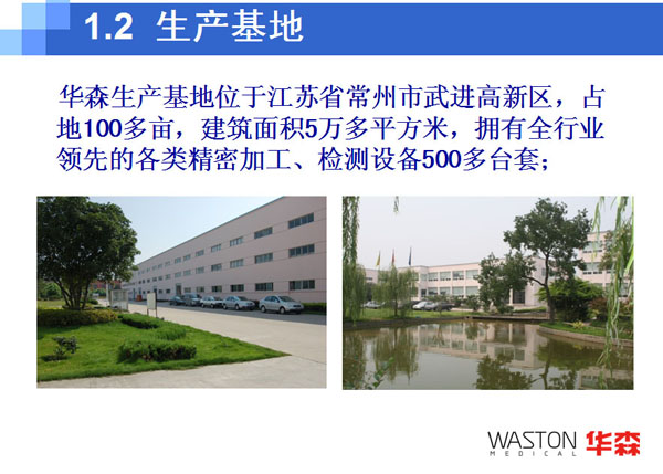 華森醫(yī)療集團(tuán)是常州聯(lián)合工具集團(tuán)控股的,由常州華森醫(yī)療器械有限公司、常州華森生物科技有限公司、常州華森醫(yī)療科技有限公司、華森三家聯(lián)動(dòng)科技創(chuàng)新中心、上海民衛(wèi)醫(yī)療器械有限公司等企業(yè)組成的集研發(fā)、制造、銷售、服務(wù)于一體的專業(yè)化醫(yī)療、健康產(chǎn)業(yè)集團(tuán)。 公司總部坐落于風(fēng)景秀麗的江南制造業(yè)基地——常州市武進(jìn)高新區(qū),西鄰常州飛機(jī)場(chǎng),北靠滬寧高速公路,南依沿江高速公路,交通十分便利。 集團(tuán)核心成員——常州華森醫(yī)療器械有限公司是由常州聯(lián)合工具集團(tuán)和日本オーテー株式會(huì)社在2001年聯(lián)合投資5000萬(wàn)人民幣成立的,專注于骨科、胸外科植入物等產(chǎn)品的開發(fā)、制造、營(yíng)銷、服務(wù)的醫(yī)療器械專業(yè)廠家。自2001年成立以來(lái)已經(jīng)成為行業(yè)領(lǐng)先的和國(guó)內(nèi)最具活力的公司之一。 華森醫(yī)療公司采用事業(yè)部制管理結(jié)構(gòu),現(xiàn)公司下設(shè)為骨科事業(yè)部、吻合器事業(yè)部、手術(shù)工具事業(yè)部及胸外科產(chǎn)品事業(yè)部等四大事業(yè)部。主要生產(chǎn)三類6846骨科植入物及人工 、二類6801基礎(chǔ)外科手術(shù)器械、6825醫(yī)用高頻儀器設(shè)備、6808腹部外科手術(shù)器械及吻(縫)合器,專利爪型純鈦肋骨接骨板等產(chǎn)品。 公司三大生產(chǎn)基地占地面積100多畝,建筑面積35000多平方米,十萬(wàn)級(jí)凈化車間2000多平方米。中高級(jí)以上職稱的研發(fā)、生產(chǎn)、質(zhì)控、管理人員占員工總?cè)藬?shù)的30%以上。公司設(shè)備精良,擁有包括德國(guó)DMG、CHIRON、美國(guó)HASS五軸加工中心、日本STAR縱切機(jī)床、SODICK慢走絲線切割在內(nèi)的著名品牌加工中心及其它高精密度機(jī)械加工設(shè)備一百多臺(tái)套,檢測(cè)設(shè)備齊全。公司與北京協(xié)和醫(yī)院,北京軍區(qū)總醫(yī)院,南京醫(yī)科大學(xué)、蘇州大學(xué)等著名醫(yī)院、學(xué)院進(jìn)行學(xué)術(shù)、技術(shù)聯(lián)盟,并依托兩大母公司的雄厚實(shí)力形成了強(qiáng)大的研發(fā)力量和生產(chǎn)能力。 華森公司為ISO13485:2003(YY/T0287-2003)國(guó)際質(zhì)量體系認(rèn)證企業(yè),所有產(chǎn)品全面通過(guò)歐盟CE認(rèn)證,其中華森吻合器已經(jīng)率先獲得了美國(guó)FDA510(K)認(rèn)證。經(jīng)過(guò)幾年的努力,華森WASTON品牌產(chǎn)品不僅出口到南美、中東、東南亞、東歐、北非等發(fā)展中國(guó)家,而且已經(jīng)開始進(jìn)入美國(guó)、法國(guó)、瑞士、德國(guó)、意大利、英國(guó)等歐美傳統(tǒng)發(fā)達(dá)國(guó)家。特別是與美國(guó)、歐洲的一些行業(yè)著名企業(yè)建立了合作聯(lián)盟關(guān)系,為華森產(chǎn)品達(dá)到或超過(guò)國(guó)際同類產(chǎn)品打下了堅(jiān)實(shí)的基礎(chǔ)。 我們歡迎國(guó)內(nèi)外新老客商、朋友前來(lái)華森考察洽談、技術(shù)交流、合作合資,與華森公司共創(chuàng)美好明天。