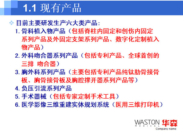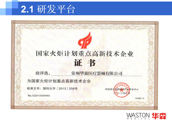 2009年:華森產(chǎn)品已經(jīng)覆蓋整個(gè)中國(guó)市場(chǎng),建立起了一支由七大區(qū)域服務(wù)中心和兩百多家經(jīng)銷商組成的銷售服務(wù)網(wǎng)絡(luò);自有品牌WASTON骨科產(chǎn)品和吻合器產(chǎn)品已經(jīng)進(jìn)入30多個(gè)國(guó)家和地區(qū),特別是WASTON吻合器已經(jīng)進(jìn)入歐洲十多個(gè)發(fā)達(dá)國(guó)家;在OEM市場(chǎng),華森已與包括全球前五位的獨(dú)立脊柱產(chǎn)品企業(yè)在內(nèi)的三十多家企業(yè)建立了合作生產(chǎn)關(guān)系;與海歸博士團(tuán)隊(duì)合作成立的常州華森生物科技有限公司正式成立;華森科技創(chuàng)新中心,即華森“三家聯(lián)動(dòng) 科技創(chuàng)新”合作平臺(tái)正式成立;