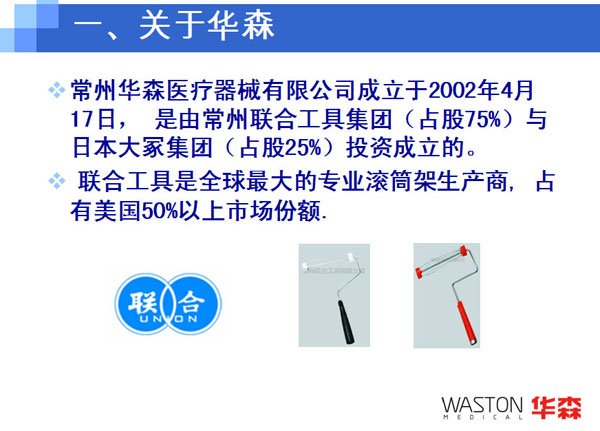 2001年:常州聯(lián)合工具集團(tuán)與日本オーテー株式會(huì)社在國(guó)家級(jí)常州高新技術(shù)區(qū)發(fā)區(qū)合資成立常州華森醫(yī)療器械有限公司,開始涉足醫(yī)療產(chǎn)業(yè),為集團(tuán)產(chǎn)業(yè)多元化奠定基礎(chǔ);