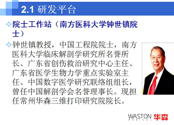 2010年:總額為兩千萬(wàn)人民幣的二期設(shè)備投資已經(jīng)完成,其中包括更多的五軸加工中心、縱切機(jī)床、車削中心、慢走絲線切割等;與眾多醫(yī)學(xué)、材料學(xué)、力學(xué)等方面的專家以及多家科研機(jī)構(gòu)合作成立常州華森醫(yī)療科技有限公司;華森全球首發(fā)的專利“數(shù)字化定制植入物”經(jīng)過(guò)幾年攻關(guān)正式推向市場(chǎng)。