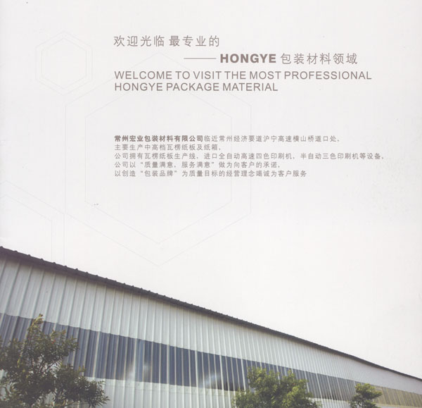 常州宏業(yè)包裝材料有限公司從最初的鮮為人知發(fā)展到現(xiàn)今包裝材料行業(yè)的主流品牌之一。公司生產(chǎn)的包裝材料產(chǎn)品不僅在國內(nèi)已經(jīng)建立了大量的穩(wěn)定的客戶,產(chǎn)品也已遠(yuǎn)銷到國外多個國家和地區(qū),深受客戶的好評。 公司臨近常州經(jīng)濟要道滬寧高速橫山道口處,主要生產(chǎn)中高檔瓦楞紙板及紙箱,公司擁有瓦楞紙板生產(chǎn)線、進(jìn)口全自動高速四色印刷機、半自動三色印刷機等設(shè)備,公司以“質(zhì)量滿意,服務(wù)滿意”做為向客戶的承諾,以創(chuàng)造“包裝品牌”為質(zhì)量目標(biāo)的經(jīng)營理念竭誠為客戶服務(wù)。 公司已通過ISO9001和1400的認(rèn)證。 宏業(yè)包裝的商業(yè)信條:宏業(yè)相信自己會成功, 宏業(yè)相信自己所銷售的商品 ,宏業(yè)員工相信自己所在的公司 ,宏業(yè)相信自己的員工和客戶,宏業(yè)相信成功并不是賺取金錢,而是創(chuàng)造信譽,只有好的信譽,成功才會有價值,宏業(yè)相信世界上最美好最偉大的詞就是“自信”,宏業(yè)相信自已每做一次銷售,就交上一個朋友。