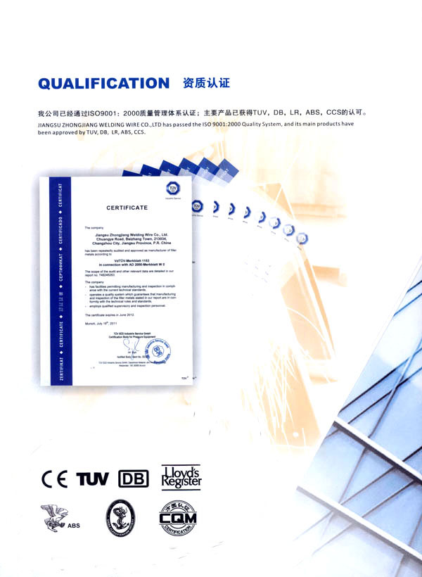 江蘇中江焊絲有限公司成立于1989年,注冊資金2188萬元,是一家專業(yè)從事氣體保護鍍銅焊絲、鋁焊絲、藥芯焊絲和埋弧焊絲的生產(chǎn)企業(yè)。 經(jīng)過近20年的不懈努力,目前企業(yè)年生產(chǎn)各類焊絲達(dá)50000余噸,產(chǎn)品不僅銷往全國各省市和地區(qū),還出口到美國、意大利、英國、法國、西班牙、波蘭、捷克、斯洛伐克、立陶宛、斯洛文尼亞、俄羅斯、烏克蘭、希臘、以色列、伊朗、南非、泰國、印尼、印度、澳大利亞等三十幾個國家和地區(qū)。 江蘇中江焊絲有限公司是通過IS09001:2000質(zhì)量管理體系認(rèn)證的企業(yè),其主要產(chǎn)品已獲得TUV,DB,LR,ABS,CCS的認(rèn)可。企業(yè)奉行“一流的產(chǎn)品,一流的信譽,一流的服務(wù)”的宗旨,竭誠為客戶服務(wù)。