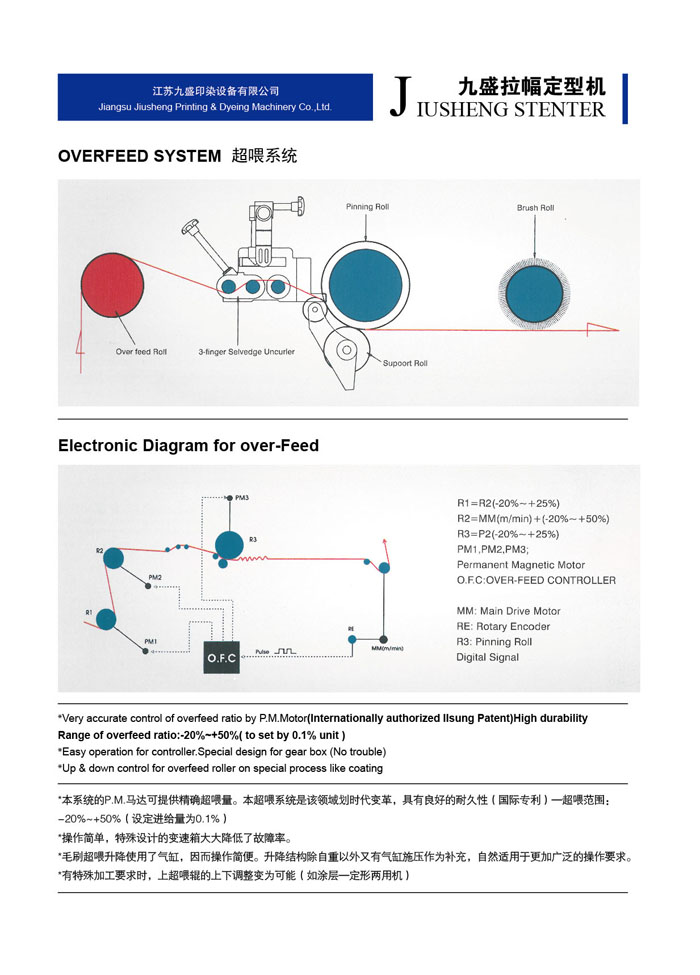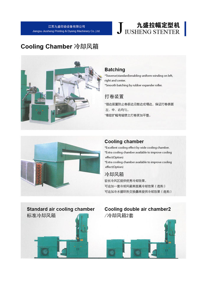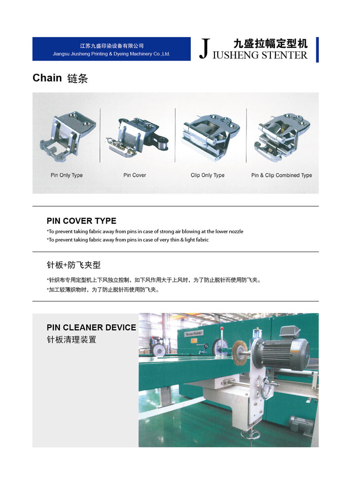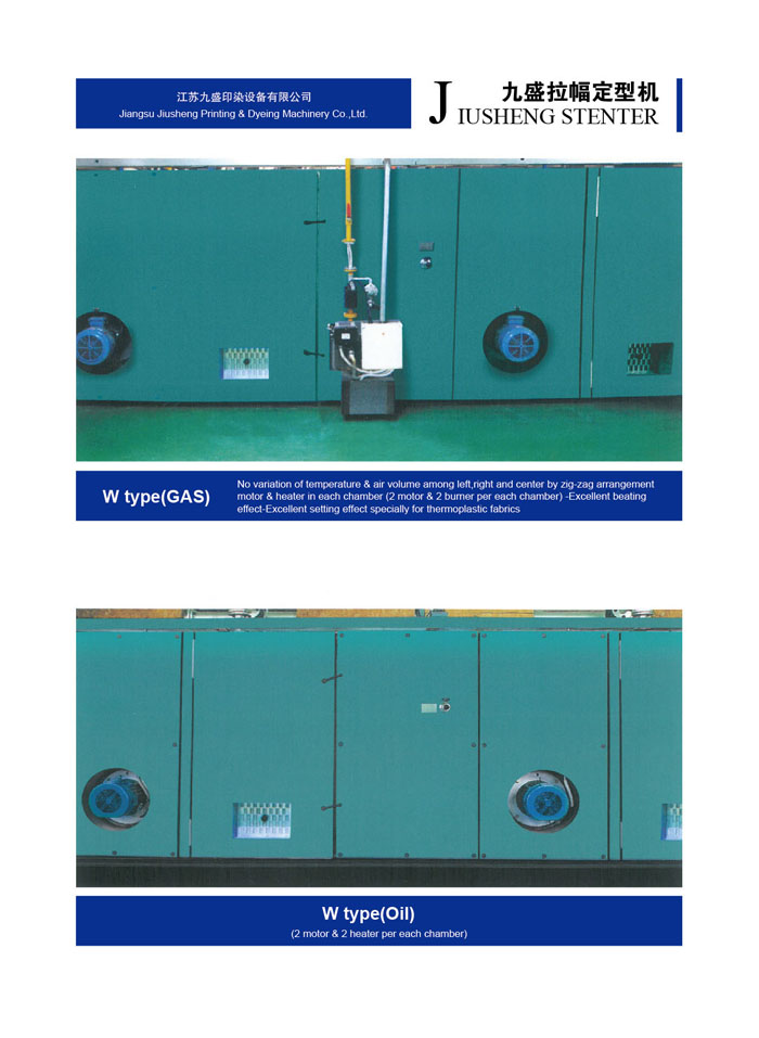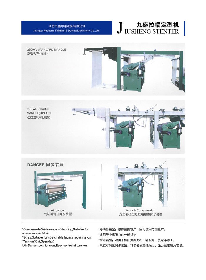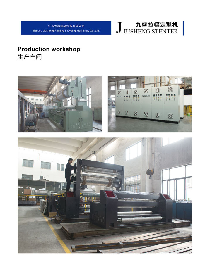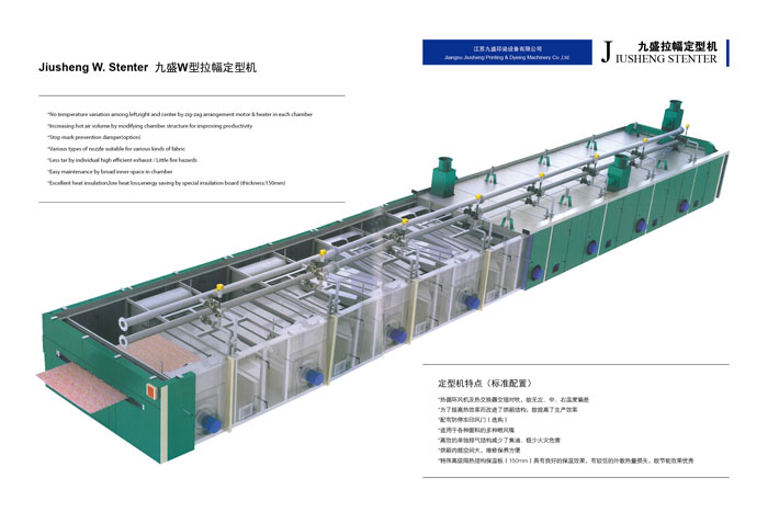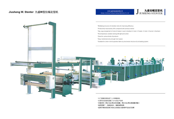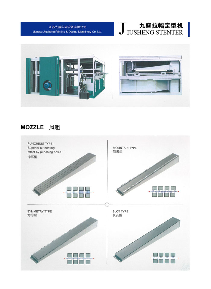 江蘇九盛印染設(shè)備有限公司(原江蘇鵬輝印染機(jī)械有限公司)創(chuàng)建于1986年,北長(zhǎng)江,所在地區(qū)內(nèi)鐵路、高等級(jí)公路縱橫成網(wǎng),常州長(zhǎng)江公路大橋飛架大江南北,水陸交通十分便利。公司有近二十年的熱定型機(jī)設(shè)計(jì)、生產(chǎn)經(jīng)驗(yàn)、有批從事新型熱定機(jī)開發(fā)、設(shè)計(jì)的專業(yè)人才,具有豐富生產(chǎn)和制作經(jīng)驗(yàn)的技師和技工。已成為國內(nèi)頗具名聲的機(jī)械制作企業(yè)。 樹脂定型是染整工程最后的程序,因此定型機(jī)的設(shè)計(jì)及操作技術(shù)成為決定織物品質(zhì)重要的一環(huán),九盛公司多年的經(jīng)驗(yàn)改良完成新生代定型機(jī),針對(duì)業(yè)者需要對(duì)于節(jié)省人力布匹張力的減少、緯紗的調(diào)整,風(fēng)量的調(diào)節(jié),布邊控制及切邊損耗及至于熱能保持,維修工作,操作管理都有卓越表現(xiàn)及實(shí)際成果,而機(jī)械的研制及生產(chǎn)技術(shù)的發(fā)展是本公司創(chuàng)立的目標(biāo)和宗旨。