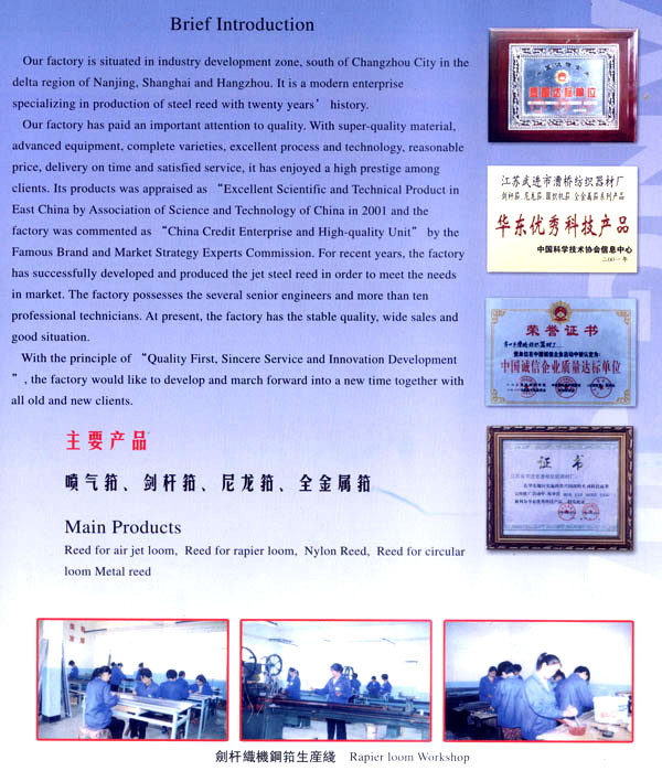 漕橋紡織器材廠位于常州市南郊寧、滬、杭金三角漕橋工業(yè)開發(fā)區(qū),是全國專業(yè)生產(chǎn)鋼筘規(guī)模較大的現(xiàn)代化廠家,已具有20年的歷史。 本廠生產(chǎn)的鋼筘有噴氣、劍桿筘、尼龍?bào)亍A織機(jī)筘和金屬筘分鉸筘、織帶筘、無梭織帶筘……本廠特別擅長生產(chǎn)高密度的劍桿筘。 本廠素以質(zhì)量為重,均采用優(yōu)質(zhì)材料制筘,如噴氣筘使用的筘片膠水鋁架等,均采用日本進(jìn)口的材料;劍桿筘筘片采用日本進(jìn)口的57B線材,膠水均采用紡織部定點(diǎn)的陜西紡織研究所生產(chǎn)的優(yōu)質(zhì)膠水、高密度劍桿筘均用進(jìn)口膠水制筘;全金屬筘均用云南的優(yōu)質(zhì)錫制筘。 各種鋼筘筘面的平整度,筘齒的均勻度、垂直度,筘片的彈性度,膠水的牢固度廣大用戶使用后感到滿意放心,特別是使用壽命特別長,受到用戶一致的盛贊,真是料好筘好,筘好布好。 本廠為了使質(zhì)量精益求精,增添了不少先進(jìn)設(shè)備,并聘請(qǐng)了數(shù)名高級(jí)工程師和十多位具有專業(yè)知識(shí)的技術(shù)人員把關(guān)。由于質(zhì)量穩(wěn)定可靠,2001年被中國科學(xué)技術(shù)協(xié)會(huì)評(píng)為“華東優(yōu)秀科技產(chǎn)品”二00二年被中國管理科學(xué)研究院名牌與市場戰(zhàn)略專家委員會(huì)評(píng)為“中國誠信企業(yè)質(zhì)量達(dá)標(biāo)單位”。 今本廠產(chǎn)品暢銷全國20多個(gè)省市,價(jià)格優(yōu)惠,供不應(yīng)求,形勢喜人。 本廠本著“以質(zhì)取勝、誠信服務(wù)、創(chuàng)新發(fā)展”的宗旨,愿與廣大新老客戶攜手共肩,昂首走進(jìn)新時(shí)代,迎接新的挑戰(zhàn)。