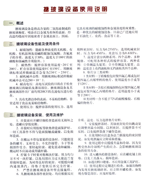 “利景”牌搪玻璃設(shè)備兼金屬材料的剛性和無機(jī)金屬材料的耐腐蝕性之雙重優(yōu)點(diǎn),搪玻璃層表面光滑、清洗方便,能隔離金屬離子,不污染也不粘物料,在化工、石油、農(nóng)藥、染料、塑料、食品等行業(yè)得到廣泛應(yīng)用。