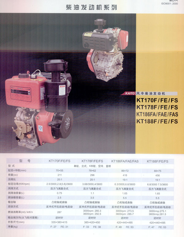 常州常柴集團(tuán)凱拓電動(dòng)機(jī)械有限公司是常柴集團(tuán)所屬,集自主研發(fā)設(shè)計(jì)及生產(chǎn)的出口型產(chǎn)業(yè)基地! 〕2窦瘓F(tuán)是一家擁有近一萬名在職員工的國有大型企業(yè),年均產(chǎn)值近三億美元,平均出口總額近八千萬美元,同時(shí)也是中國內(nèi)地五百強(qiáng)企業(yè)之一。 常柴集團(tuán)凱拓電動(dòng)機(jī)械有限公司的主要產(chǎn)品流水線基于日本YAMMAR型超級(jí)風(fēng)冷柴油發(fā)動(dòng)機(jī),以及其配套發(fā)電機(jī)組,水泵機(jī)組和數(shù)碼變頻發(fā)電機(jī),我司目前擁有常柴集團(tuán)及凱拓品牌的知名商標(biāo)使用權(quán),旗下所有分廠如機(jī)械加工廠、鑄造廠以及發(fā)動(dòng)機(jī)廠等生產(chǎn)基地都通過了ISO9001-2000質(zhì)量管理體系認(rèn)證。我司自主品牌凱拓柴油發(fā)電機(jī)組KT5000SE,KT5000LE,數(shù)碼變頻發(fā)電機(jī)KT1000Ti以及柴油發(fā)動(dòng)機(jī)186F均通過德國TUV公司的CE認(rèn)證,美洲EPA認(rèn)證,因此出口量很大,近年來公司產(chǎn)品已遠(yuǎn)銷美洲、歐洲、非洲以及東南亞國家和地區(qū)。 依托常柴集團(tuán)的領(lǐng)先技術(shù),強(qiáng)有力的管理體制,以及健全的產(chǎn)品質(zhì)量體系,我司通過不斷優(yōu)化自主設(shè)計(jì)研發(fā),完善管理機(jī)制,期望能夠以提供最優(yōu)質(zhì)的產(chǎn)品售后服務(wù)進(jìn)一步拓展國際市場! ”局皥F(tuán)結(jié)、合作、奮斗”的公司理念,我們希望著眼全球,與更多潛在的客戶開展合作交流,最終實(shí)現(xiàn)雙贏的戰(zhàn)略目標(biāo)。