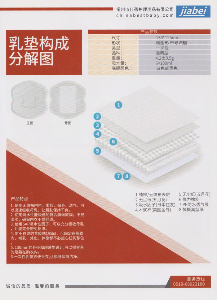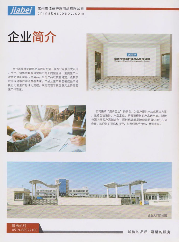 常州市佳蓓護(hù)理用品有限公司是一家專業(yè)從事開(kāi)發(fā)、生產(chǎn)、銷售并具備自營(yíng)出口的外向型企業(yè),主要生產(chǎn)“一次性防溢乳墊“,以質(zhì)量穩(wěn)定,柔軟親膚而深受客戶和消費(fèi)者青睞。本公司產(chǎn)品從生產(chǎn)到包裝成品嚴(yán)格執(zhí)行無(wú)菌生產(chǎn)標(biāo)準(zhǔn)化流程,并和設(shè)備生產(chǎn)廠家合作開(kāi)發(fā)了兩條從進(jìn)料、生產(chǎn)、檢測(cè)、滅菌、成品包裝的無(wú)菌生產(chǎn)線,從而實(shí)現(xiàn)了真正意義上的無(wú)菌生產(chǎn)標(biāo)準(zhǔn)化。