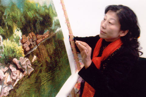狄靜簡(jiǎn)介: 狄靜現(xiàn)為江蘇省工藝美術(shù)大師,江蘇省非物質(zhì)文化遺產(chǎn)傳承人,研究員級(jí)高級(jí)工藝美術(shù)師,常州工藝美術(shù)家協(xié)會(huì)副主席兼秘書長(zhǎng),常州工藝美術(shù)行業(yè)協(xié)會(huì)副會(huì)長(zhǎng),1995年被聯(lián)合國(guó)教科文組織授予“民間工藝美術(shù)家”稱號(hào)。狄靜七十年代進(jìn)常州市工藝美術(shù)研究所從事亂針繡藝術(shù)工作,曾受亂針繡創(chuàng)始人楊守玉先生親自指導(dǎo)和教誨。她從一名學(xué)員逐步走上了常州市工藝美術(shù)研究所亂針繡研究室主任,副所長(zhǎng)、所長(zhǎng)的崗位。 多年來,狄靜獨(dú)立完成的作品獲得了諸多榮譽(yù): 1993年《鄧小平》入選第一屆工藝美術(shù)名家作品展, 1995年被聯(lián)合國(guó)教科文組織授予“民間工藝美術(shù)家”稱號(hào), 1997年受新加坡政府邀請(qǐng),進(jìn)行為期一個(gè)月的文化藝術(shù)交流, 2000年《可愛的小鳥》榮獲第二屆中國(guó)工藝美術(shù)大師精品展的銀獎(jiǎng)。這是亂針繡作品自1982年奪得全國(guó)工藝美術(shù)百花獎(jiǎng)金杯獎(jiǎng)以來,沉默整整18年后東山再起的耀眼亮相, 2004年,狄靜創(chuàng)作的亂針繡作品《展望》榮獲中國(guó)工藝美術(shù)精品展金獎(jiǎng),同年,