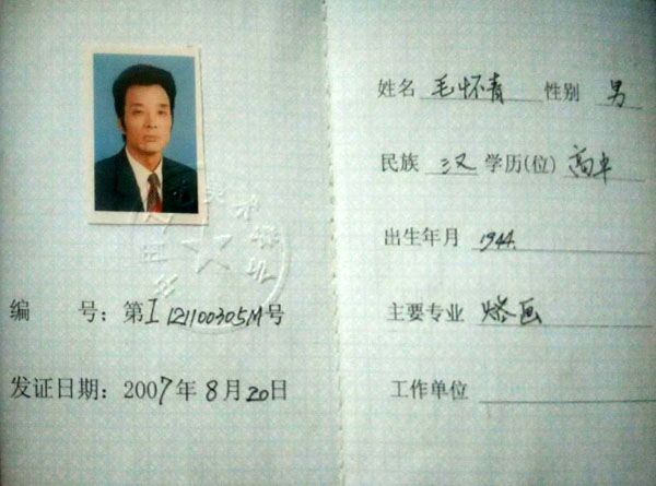 毛懷青,江蘇常州市武進(jìn)人。 中國工藝美術(shù)學(xué)會會員,常州市中國烙畫研究會副會長,常州市文博鑒賞協(xié)會理事,非物質(zhì)文化遺產(chǎn)烙畫傳承人。高級工藝美術(shù)師。 年輕時(shí)學(xué)習(xí)國畫、油畫中年蔓現(xiàn)掌州咯畫源遠(yuǎn)流長、歷史悠久,有著其它美術(shù)門類不具備的藝術(shù)風(fēng)格與特色?芍^是工藝美術(shù)中的一朵十分亮麗的藝術(shù)奇葩,是我民族先人給我們留下的一份不可多得十分珍貴的一份文化遺產(chǎn)。為弘揚(yáng)與發(fā)展這份優(yōu)秀文化遺產(chǎn),我從此下定決心研究烙畫,愿付出一份力量為振興烙畫事業(yè)做出貢獻(xiàn)。至今已潛心研究幾十年,取得了可喜的成績,被業(yè)界公認(rèn),社會關(guān)注與認(rèn)可。有“江南烙畫第一筆”之美譽(yù)。 近年來,創(chuàng)作的烙畫作品分別獲得過全國、省市級的金、銀、銅獎多次。中央電視臺曾兩次播放過本人的烙畫作品,江蘇電視臺、常州電視臺也曾多次播放過本人的作品與烙畫藝術(shù)生涯,揚(yáng)子晚報(bào)、常州日報(bào)、常州晚報(bào)也曾多次報(bào)導(dǎo)過本人的烙畫作品,出版物有三種版本都能查閱到介紹本的烙畫從藝生涯與藝術(shù)業(yè)績。