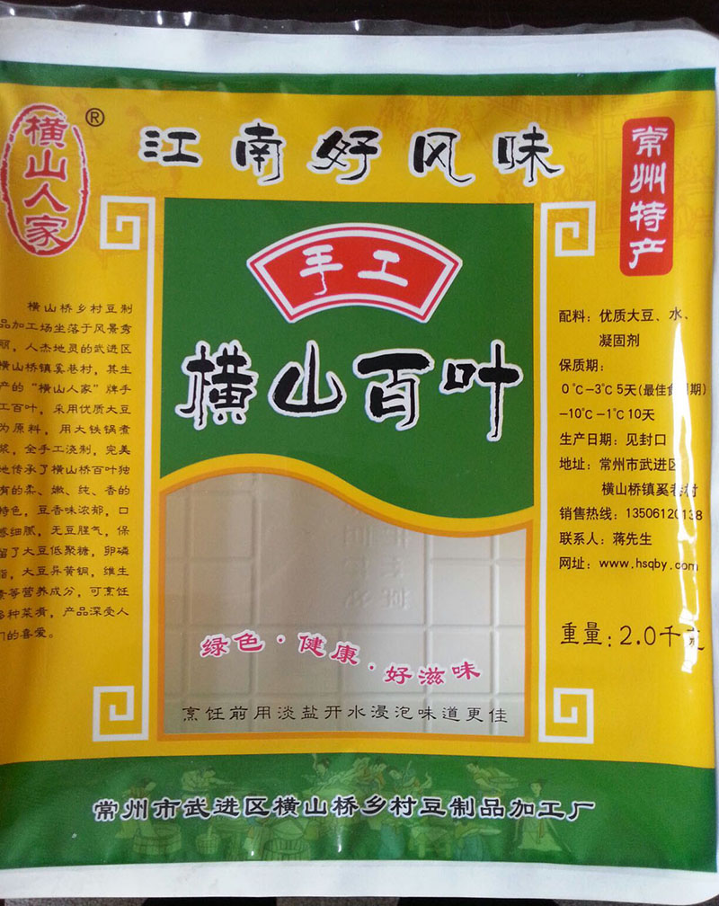 橫山橋鄉(xiāng)村豆制品加工場坐落于風景秀麗,人杰地靈的武進區(qū)橫山橋鎮(zhèn)奚巷村,其生產(chǎn)的“橫山人家”牌手工百葉,采用優(yōu)質大豆為原料,用大鐵鍋煮漿,全手工澆制,完美地傳承了橫山橋百葉獨有的柔、嫩、純、香的特色,豆香味濃郁,口感細膩,無豆腥氣,保留了大豆低聚糖,卵磷脂,大豆異黃銅,維生素等營養(yǎng)成分,可烹飪多種菜肴。產(chǎn)品主要銷往上海、南京以及常武地區(qū)的各大飯店,深受人們的喜愛。 多年來,我們積極倡導“誠信如同生命,口碑重于泰山”的經(jīng)營理念,高度重視產(chǎn)品質量和衛(wèi)生,力爭讓“橫山人家”品牌豆制品成為消費者最安全!最貼心!最認可的橫山橋百葉品牌。