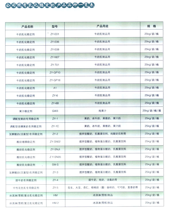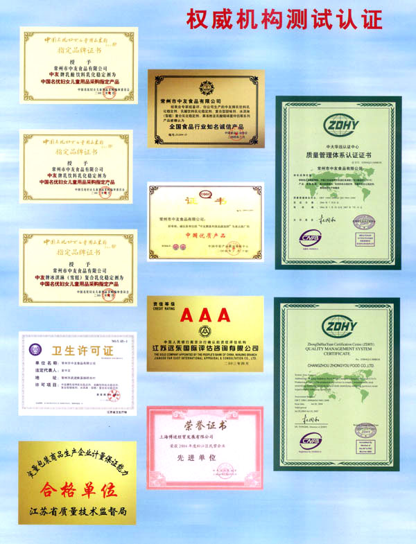 常州市中友食品有限公司;匚挥诔V菔袞|郊開發(fā)區(qū),廠房占地面積6000平方米,擁有全新的生產(chǎn)線,先進(jìn)的生產(chǎn)流程和嚴(yán)格的質(zhì)量管理體系(工廠已通過IS09001:2000質(zhì)量管理體系的認(rèn)證)。并有專業(yè)的技術(shù)開發(fā)和理化檢驗(yàn)的設(shè)施、經(jīng)驗(yàn)豐富的技術(shù)人員。公司以科技為依托,常年與高等院校合作,不斷地開發(fā)和研制適合市場(chǎng)需求的食品添加劑系列產(chǎn)品。公司每年面向全國(guó)招收優(yōu)秀的博士、碩士及優(yōu)秀的大學(xué)生。公司現(xiàn)有員工1 00多人,管理人員2 0名、高工5名、產(chǎn)品專業(yè)技術(shù)開發(fā)人員12名,還有選擇地引進(jìn)和代理國(guó)內(nèi)外各種適用的食品添加劑。 依靠本公司雄厚的科技力量和先進(jìn)的科技設(shè)備,生產(chǎn)基地已經(jīng)具備了與客戶共同開發(fā)國(guó)內(nèi)外先進(jìn)食品添加劑的應(yīng)用技術(shù)。博適中友公司多年來致力于食品添加劑的研究和開發(fā),突破常規(guī)理念,以市場(chǎng)、用戶為中心,研究開發(fā)各個(gè)品種、各個(gè)檔次的食品添加劑,品種齊全又多樣,既有出口型又有內(nèi)銷型。公司主要穩(wěn)定劑產(chǎn)品有:乳飲料乳化穩(wěn)定劑、乳酸飲料乳化穩(wěn)定劑、冰淇淋(雪糕)復(fù)合乳化穩(wěn)定劑、果汁飲料乳化穩(wěn)定劑等,產(chǎn)品暢銷國(guó)內(nèi)外,覆蓋了全國(guó)二十多個(gè)省市,并建立了穩(wěn)定的銷售網(wǎng)絡(luò)。 本公司對(duì)產(chǎn)品指定了嚴(yán)格的質(zhì)量標(biāo)準(zhǔn),并報(bào)請(qǐng)常州市技術(shù)檢驗(yàn)監(jiān)督局審核批準(zhǔn),其技術(shù)要求完全符合GB一2760(食品添加劑使用衛(wèi)生標(biāo)準(zhǔn))和符合聯(lián)合國(guó)直接衛(wèi)生組織(WHO)、聯(lián)合國(guó)食品與農(nóng)業(yè)組織(FAO)以及美國(guó)食品和藥物管理局的有關(guān)規(guī)定。 長(zhǎng)期以來,博適中友公司以市場(chǎng)定位為基本依據(jù),堅(jiān)持發(fā)展并開辟多元化的國(guó)內(nèi)外市場(chǎng):以專業(yè)化、長(zhǎng)遠(yuǎn)化、規(guī);癁榻(jīng)營(yíng)思路:以開拓創(chuàng)新,務(wù)實(shí)誠(chéng)信為經(jīng)營(yíng)理念,不斷促進(jìn)企業(yè)發(fā)展壯大。 公司自創(chuàng)建以來,始終不渝地堅(jiān)持質(zhì)量第一、信譽(yù)至上,以精湛的工藝加工產(chǎn)品,不管是標(biāo)準(zhǔn)的或特制的都可享有本公司優(yōu)良的技術(shù)服務(wù)。無(wú)論您需要何種功能性添加劑,博適中友食品添加劑公司均能滿足您的要求。博適中友公司以價(jià)格合理、服務(wù)周到為經(jīng)營(yíng)宗旨,努力引導(dǎo)食品添加劑應(yīng)用發(fā)展的新潮流、新方向。在才能卓越的領(lǐng)導(dǎo)者的帶領(lǐng)下,全體員工以開拓、創(chuàng)新、求實(shí)、守信為企業(yè)精神,不斷地提高自身的素質(zhì)。 公司的宗旨是“開拓創(chuàng)新發(fā)展、精誠(chéng)服務(wù)和諧”為目標(biāo),熱忱與各界有識(shí)之士攜手共進(jìn),共創(chuàng)輝煌!如今公司業(yè)務(wù)蒸蒸日上,專業(yè)技術(shù)研究越走越精,這都與廣大客戶大力支持分不開。在新世紀(jì)來臨之際,上海博適中友公司愿與您真誠(chéng)合作,攜手并進(jìn),共鑄新的輝煌!