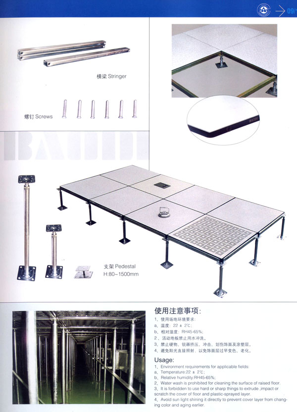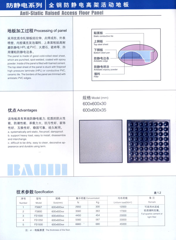 常州市寶進(jìn)防靜電設(shè)備有限公司是各類防靜電產(chǎn)品開發(fā)、設(shè)計、制造、安裝服務(wù)于一體的企業(yè)。以上海物理學(xué)會空間靜電專業(yè)委員會強(qiáng)大的技術(shù)力量為后盾。公司主要致力于各類機(jī)房、電氣室設(shè)計、安裝;各類防靜電干擾處理及用戶特種需求。公司擁有防空間靜電干擾—聲學(xué)復(fù)合系統(tǒng)、輕質(zhì)全鋼活動地板、高環(huán)保型抗靜電貼面等多項發(fā)明專利,是國內(nèi)該行業(yè)中唯一擁有自主知識產(chǎn)權(quán)的企業(yè)。 公司主要產(chǎn)品“寶迪”牌 防靜電高架地板及板材、OA網(wǎng)絡(luò)地板。產(chǎn)品廣泛用于電子廠房、金融系統(tǒng)、電力、廣電、軍隊及智能化樓宇。并向多個國家出口。 針對發(fā)泡水泥填充的全鋼高架地板自身重、承載差的缺點(diǎn),我們開發(fā)了輕質(zhì)全鋼高架地板。在提前地板承載的同時,大幅減輕了地板的自重。 公司一貫嚴(yán)格執(zhí)行ISO9001-2000質(zhì)量保證體系,為用戶提供高品質(zhì)的產(chǎn)品及完善的售后服務(wù)是公司一貫的宗旨。