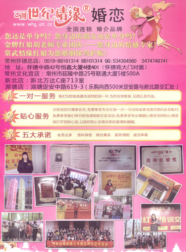 常州創(chuàng)世紀(jì)情緣婚介--是以實體婚介、活動操作、網(wǎng)絡(luò)婚介三大結(jié)合。也是常州最大的國家商務(wù)部特許全國連鎖品牌婚介,并自主創(chuàng)建品牌:常武情緣紅娘婚戀服務(wù)中心。目前是常州地區(qū)實力最大,口碑最好的婚介品牌連鎖機(jī)構(gòu).本公司曾榮獲江蘇優(yōu)質(zhì)誠信服務(wù)單位,常州市婚姻協(xié)會婚介理事單位,也是優(yōu)秀會員單位,也是武進(jìn)區(qū)便民服務(wù)單位,榮獲優(yōu)秀紅娘獎 金牌紅娘獎,優(yōu)秀門店獎等榮譽(yù) !冻V萃韴蟆 《揚(yáng)子晚報》,央視,百度,化龍巷等長期合作單位。在工作中我們本著誠實守信、為會員保密的準(zhǔn)則。 金牌紅娘胡老師專業(yè)團(tuán)隊服務(wù)宗旨是:架鵲橋,促良緣,真誠守信,用心溝通 用心服務(wù);我們的工作態(tài)度是:熱情、周到、不卑不亢。 我們的目標(biāo):打造常州婚戀第一中高端品牌,為客戶提供最高效率、最高質(zhì)量的專業(yè)婚戀服務(wù)。我們的優(yōu)勢是:平臺大,會員多,機(jī)會多,成功率高。一對一的全程婚戀服務(wù),專業(yè)婚戀情感輔導(dǎo),量身定制征婚方案。電腦海選加人工配對相結(jié)合的先進(jìn)手段專為忙碌的城市白領(lǐng)省時高效地成就姻緣。走進(jìn)情緣讓幸福不再遙遠(yuǎn)。常武情緣紅娘為您婚姻保駕護(hù)航.給您百里挑一的機(jī)會,給您幸福一生的情緣”.找對象就找金牌紅娘胡老師專業(yè)團(tuán)隊!地址:常州懷德店:懷德中路42號恒鑫大廈4樓401,(懷德苑北門對面),電話:0519-88161314,金牌紅娘胡老師:18015073344(微信同步)
