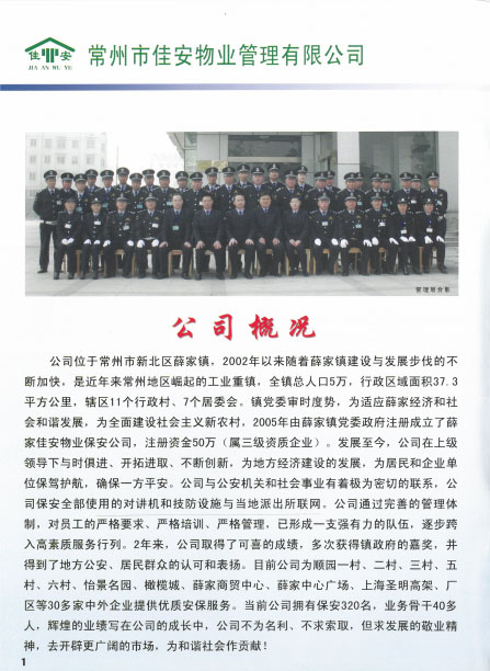 佳安物業(yè)管理有限公司位于常州市新北區(qū)薛家鎮(zhèn),2005年由薛家鎮(zhèn)黨委政府注冊成立,注冊資金50萬元,屬于三級(jí)資質(zhì)企業(yè)。成立之初,佳安物業(yè)作為政屬事業(yè)單位,主要負(fù)責(zé)管理薛家鎮(zhèn)順園新村安置小區(qū)。隨著薛家鎮(zhèn)經(jīng)濟(jì)和人口的發(fā)展,為主動(dòng)適應(yīng)經(jīng)濟(jì)發(fā)展新常態(tài),全面深化物業(yè)綜合改革,打造具有薛家特色的物業(yè)公司,佳安物業(yè)由政府下屬的事業(yè)單位正式轉(zhuǎn)變?yōu)楠?dú)立運(yùn)營的企業(yè),并增資到1000萬元。 2017年6月,公司通過審核被評(píng)為“AAA”級(jí)信用企業(yè),同月,公司實(shí)施ISO9001質(zhì)量管理體系標(biāo)準(zhǔn),并于8月通過質(zhì)量體系認(rèn)證審核。2018年8月,公司通過了ISO14001環(huán)境管理體系、ohsas18001職業(yè)健康安全管理體系的認(rèn)證審核。 目前,公司主要承接小區(qū)物業(yè)服務(wù)及廠區(qū)外派保安服務(wù)、保潔服務(wù)等,F(xiàn)公司為薛家鎮(zhèn)順園一村至順園九村安置小區(qū)及奧林匹克花園、怡景名園2處商業(yè)小區(qū)提供物業(yè)服務(wù);為江南農(nóng)村商業(yè)銀行新北區(qū)所有支行、中車鐵馬、投資服務(wù)中心、華夏藝博園、薛家幼兒園、薛家小學(xué)及薛家中學(xué)等單位提供外派保安服務(wù);為薛家鎮(zhèn)中心廣場及松林別墅提供保安服務(wù);為華夏藝博園及投資服務(wù)中心提供保潔服務(wù)等。 在這十余年中,佳安物業(yè)與時(shí)俱進(jìn),銳意進(jìn)取,為地方建設(shè)發(fā)展注入動(dòng)力,為居民和企業(yè)安全保駕護(hù)航,尤其是在實(shí)踐中,我們積極探索,正逐步摸索出一條適合薛家城鄉(xiāng)一體化建設(shè)的社區(qū)物業(yè)管理的新路。希望通過今天的分享,和大家一起探討我們在“管辦分離”等方面的實(shí)踐經(jīng)驗(yàn),并在此基礎(chǔ)上為薛家的可持續(xù)發(fā)展提供可借鑒、推廣的新型物業(yè)管理之路。