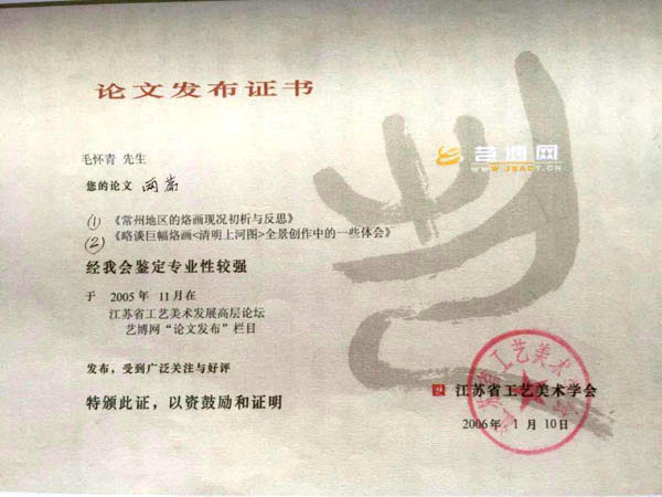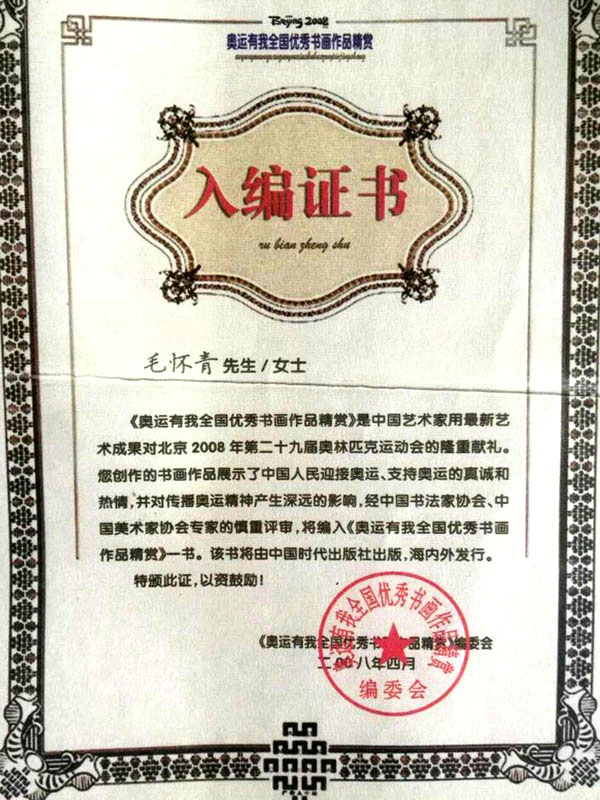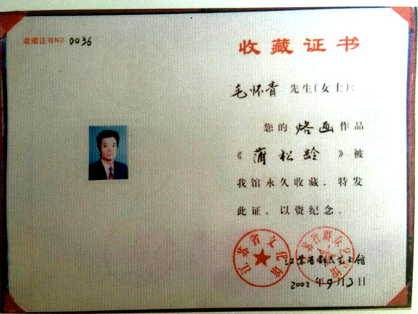 毛懷青,江蘇常州市武進(jìn)人。 中國工藝美術(shù)學(xué)會(huì)會(huì)員,常州市中國烙畫研究會(huì)副會(huì)長(zhǎng),常州市文博鑒賞協(xié)會(huì)理事,非物質(zhì)文化遺產(chǎn)烙畫傳承人。高級(jí)工藝美術(shù)師。 年輕時(shí)學(xué)習(xí)國畫、油畫中年蔓現(xiàn)掌州咯畫源遠(yuǎn)流長(zhǎng)、歷史悠久,有著其它美術(shù)門類不具備的藝術(shù)風(fēng)格與特色。可謂是工藝美術(shù)中的一朵十分亮麗的藝術(shù)奇葩,是我民族先人給我們留下的一份不可多得十分珍貴的一份文化遺產(chǎn)。為弘揚(yáng)與發(fā)展這份優(yōu)秀文化遺產(chǎn),我從此下定決心研究烙畫,愿付出一份力量為振興烙畫事業(yè)做出貢獻(xiàn)。至今已潛心研究幾十年,取得了可喜的成績(jī),被業(yè)界公認(rèn),社會(huì)關(guān)注與認(rèn)可。有“江南烙畫第一筆”之美譽(yù)。 近年來,創(chuàng)作的烙畫作品分別獲得過全國、省市級(jí)的金、銀、銅獎(jiǎng)多次。中央電視臺(tái)曾兩次播放過本人的烙畫作品,江蘇電視臺(tái)、常州電視臺(tái)也曾多次播放過本人的作品與烙畫藝術(shù)生涯,揚(yáng)子晚報(bào)、常州日?qǐng)?bào)、常州晚報(bào)也曾多次報(bào)導(dǎo)過本人的烙畫作品,出版物有三種版本都能查閱到介紹本的烙畫從藝生涯與藝術(shù)業(yè)績(jī)。