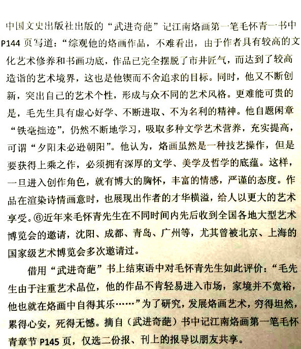 毛懷青,江蘇常州市武進(jìn)人。 中國(guó)工藝美術(shù)學(xué)會(huì)會(huì)員,常州市中國(guó)烙畫研究會(huì)副會(huì)長(zhǎng),常州市文博鑒賞協(xié)會(huì)理事,非物質(zhì)文化遺產(chǎn)烙畫傳承人。高級(jí)工藝美術(shù)師。 年輕時(shí)學(xué)習(xí)國(guó)畫、油畫中年蔓現(xiàn)掌州咯畫源遠(yuǎn)流長(zhǎng)、歷史悠久,有著其它美術(shù)門類不具備的藝術(shù)風(fēng)格與特色。可謂是工藝美術(shù)中的一朵十分亮麗的藝術(shù)奇葩,是我民族先人給我們留下的一份不可多得十分珍貴的一份文化遺產(chǎn)。為弘揚(yáng)與發(fā)展這份優(yōu)秀文化遺產(chǎn),我從此下定決心研究烙畫,愿付出一份力量為振興烙畫事業(yè)做出貢獻(xiàn)。至今已潛心研究幾十年,取得了可喜的成績(jī),被業(yè)界公認(rèn),社會(huì)關(guān)注與認(rèn)可。有“江南烙畫第一筆”之美譽(yù)。 近年來,創(chuàng)作的烙畫作品分別獲得過全國(guó)、省市級(jí)的金、銀、銅獎(jiǎng)多次。中央電視臺(tái)曾兩次播放過本人的烙畫作品,江蘇電視臺(tái)、常州電視臺(tái)也曾多次播放過本人的作品與烙畫藝術(shù)生涯,揚(yáng)子晚報(bào)、常州日?qǐng)?bào)、常州晚報(bào)也曾多次報(bào)導(dǎo)過本人的烙畫作品,出版物有三種版本都能查閱到介紹本的烙畫從藝生涯與藝術(shù)業(yè)績(jī)。