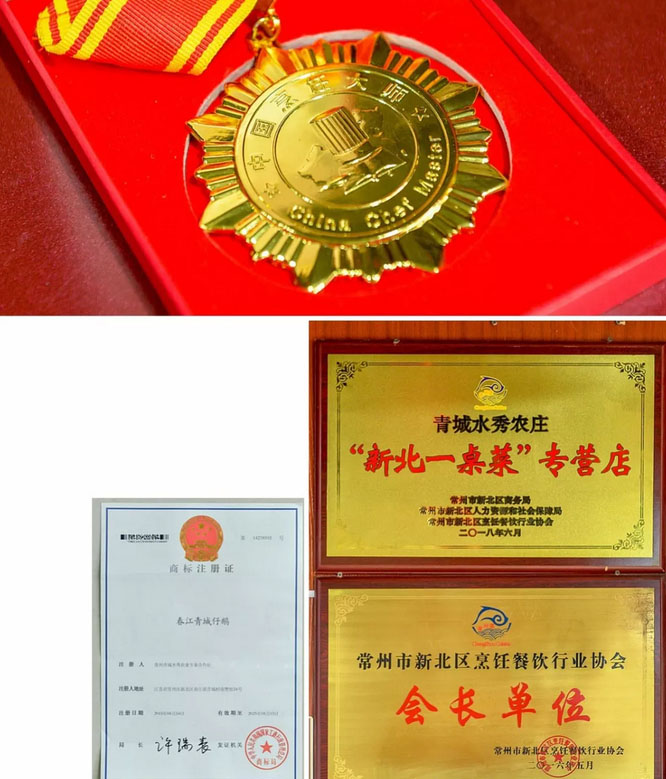 2018年“青城仔鵝”入選新北區(qū)評選出的“十大特色名菜”之首,法人朱全林還獲得“中國烹飪大師”稱號。幾年中,還參加由區(qū)、鎮(zhèn)舉辦的各項美食文化活動:春江江鮮莢食文化節(jié),新北區(qū)江鮮美食文化旅游節(jié)暨“中洋杯”河豚技能大賽等。