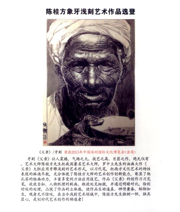 陳桂方,江蘇常州武進(jìn)人,中國著名雕刻藝術(shù)家,江蘇省工藝美術(shù)大師、研究員級(jí)、高級(jí)工藝美術(shù)師,江蘇省非物質(zhì)文化遺產(chǎn)《象牙淺刻》代表性傳承人。畢業(yè)于中國書畫函授大學(xué),深造于清華大學(xué)、南大美術(shù)系,現(xiàn)任中國工藝美術(shù)協(xié)會(huì)會(huì)員,江蘇省工藝美術(shù)學(xué)會(huì)理事,常州市工藝美術(shù)家協(xié)會(huì)副秘書長(zhǎng),常州市工藝美術(shù)行業(yè)協(xié)會(huì)常務(wù)理事,武進(jìn)工藝美術(shù)協(xié)會(huì)副主席。陳桂方大師淺刻作品的藝術(shù)特點(diǎn):山水氣韻生動(dòng),氣勢(shì)磅礴,場(chǎng)面壯觀,刀法細(xì)膩:人物仕女生動(dòng)可人,栩栩如生,充分表達(dá)體現(xiàn)了中國象牙工藝獨(dú)具的內(nèi)在文化底蘊(yùn)和現(xiàn)代社會(huì)的審美觀念及獨(dú)特的淺刻藝術(shù)表現(xiàn)技藝。對(duì)每件藝術(shù)作品創(chuàng)作都精益求精,強(qiáng)調(diào)藝術(shù)創(chuàng)作的思想性、意境及內(nèi)涵。注重章法構(gòu)思,掌握牙刻藝術(shù)的特性表現(xiàn),作品具有鮮明生動(dòng)的時(shí)代氣息,獨(dú)具所創(chuàng)工筆與寫意相結(jié)合的牙刻藝術(shù)表現(xiàn)手法和表現(xiàn)形式,出眾、飄逸、多變的刀法技藝,粗獷處見細(xì)微、方寸間見大觀的創(chuàng)作理念深受專家權(quán)威的肯定和業(yè)內(nèi)人士的一致好評(píng)。陳桂方大師至企頑事象牙淺刻藝術(shù)創(chuàng)作近四十余載,完善了自己的創(chuàng)作體系,成就了自己獨(dú)特的藝術(shù)風(fēng)格。作品數(shù)年來連續(xù)二十多次榮獲國家最高藝術(shù)精品大獎(jiǎng)《金獎(jiǎng)》,象牙淺刻作品《李逵探母》已被國家工藝美術(shù)館收藏,并頒發(fā)了國家收藏證書,在全國數(shù)十年間尚屬首次。當(dāng)前,陳桂方牙刻藝術(shù)作品已深受廣大海內(nèi)外業(yè)內(nèi)人士、收藏家們的鐘愛、青睞、熱藏,并被譽(yù)為當(dāng)代最杰出最具潛質(zhì)的實(shí)力派藝術(shù)大師。