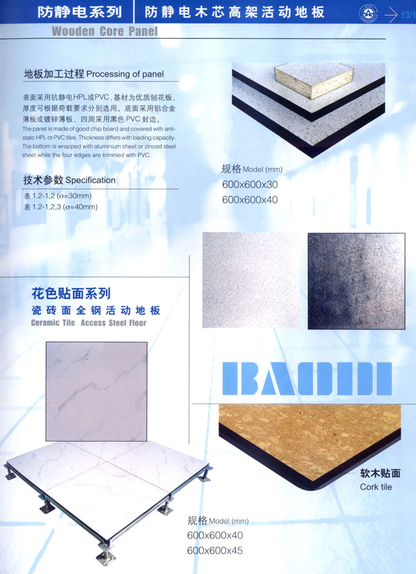 常州市寶進防靜電設(shè)備有限公司是各類防靜電產(chǎn)品開發(fā)、設(shè)計、制造、安裝服務(wù)于一體的企業(yè)。以上海物理學(xué)會空間靜電專業(yè)委員會強大的技術(shù)力量為后盾。公司主要致力于各類機房、電氣室設(shè)計、安裝;各類防靜電干擾處理及用戶特種需求。公司擁有防空間靜電干擾—聲學(xué)復(fù)合系統(tǒng)、輕質(zhì)全鋼活動地板、高環(huán)保型抗靜電貼面等多項發(fā)明專利,是國內(nèi)該行業(yè)中唯一擁有自主知識產(chǎn)權(quán)的企業(yè)。 公司主要產(chǎn)品“寶迪”牌 防靜電高架地板及板材、OA網(wǎng)絡(luò)地板。產(chǎn)品廣泛用于電子廠房、金融系統(tǒng)、電力、廣電、軍隊及智能化樓宇。并向多個國家出口。 針對發(fā)泡水泥填充的全鋼高架地板自身重、承載差的缺點,我們開發(fā)了輕質(zhì)全鋼高架地板。在提前地板承載的同時,大幅減輕了地板的自重。 公司一貫嚴(yán)格執(zhí)行ISO9001-2000質(zhì)量保證體系,為用戶提供高品質(zhì)的產(chǎn)品及完善的售后服務(wù)是公司一貫的宗旨。