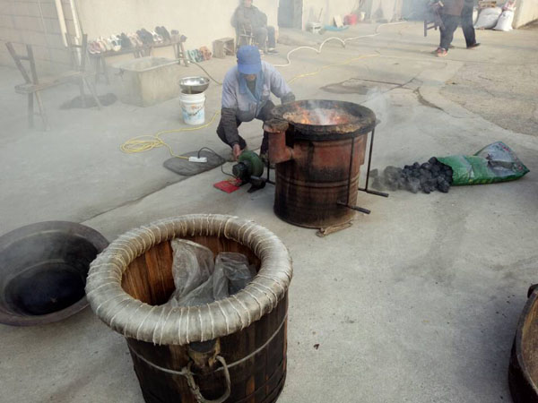 第一步:蒸糯米飯,老徐先用煤爐將水燒開,再將洗凈泡好的糯米放入一只大木桶中,放在爐子上蒸。除此以外,老徐還要不斷攪拌,保證糯米受熱均勻,直至散發(fā)出水蒸氣。為了保證米飯溫度,老徐特地用塑料薄膜將木桶封住,并用皮筋加固。蒸糯米飯,大約需要半個多小時。