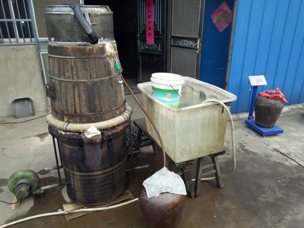 第四步:放入缸中,酒曲和糯米拌好后,便可放入屋內(nèi)的大缸中,并在其中挖出個圓形的洞,放入竹筒做酒窩。在此之前,大缸可用之前冷卻糯米飯的溫水擦一擦暖缸,這樣更有益于酒曲發(fā)酵。為了保證酒曲發(fā)酵的溫度,還要給酒料附上塑料薄膜。若是氣溫低于零度,還得多蓋上幾層棉被才行。像池阿姨家的400斤糯米,老徐至少要重復這些步驟八遍!大缸中的酒料大約發(fā)酵了10天左右,在酒乳已非常豐富之際,按照1:1的比例,打開封口加入冷開水,然后再蓋上棉被。繼續(xù)放置45天后,米酒才算大功告成!如果覺得米酒不過癮,老徐還會將米酒吊成燒酒,也就是白酒,依舊是傳統(tǒng)的老手藝。未來某天,TA會消失 ,其實,做米酒的方法并不難,幾乎是以前家家戶戶的必備技能。然而現(xiàn)如今,不僅老常州們不再自己做酒,就連像老徐這樣的做米酒手藝人也越來越少。就連跟了老徐三十多年的一套米酒家當,也同樣經(jīng)不起歲月:鐵鍋漏了要去找橫山橋的老師傅;木桶壞了要去禮嘉修;爐子也有專門的式樣,過幾年就要拿著圖紙找人翻新......