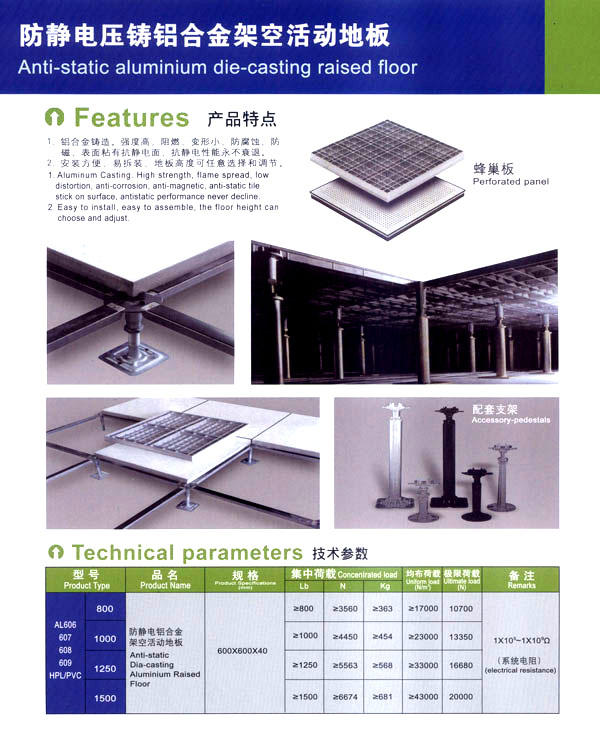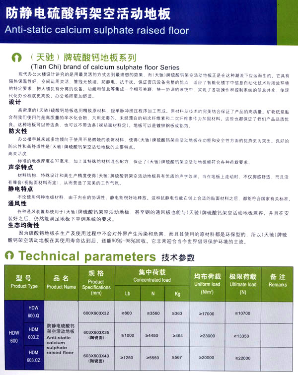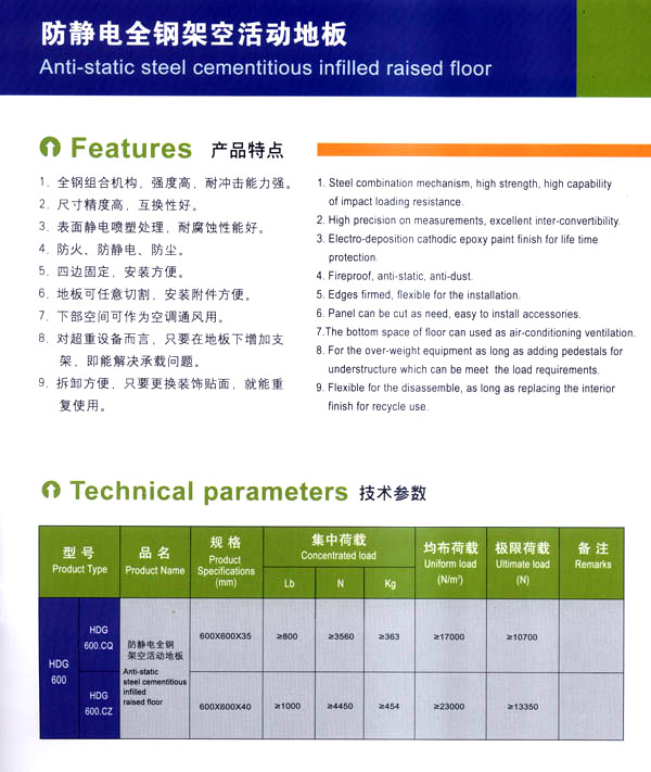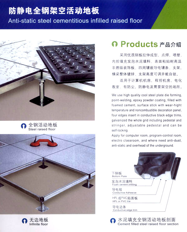 公司專業(yè)生產(chǎn)“天馳”系列活動(dòng)地板,符合國(guó)家安全要求,種類完備多樣,其中防靜電瓷質(zhì)高架通路地板除具有普通瓷質(zhì)的裝飾和實(shí)用性外,其耐磨,防水,防火功能優(yōu)于其他同類產(chǎn)品,深受客戶歡迎。