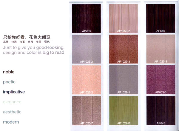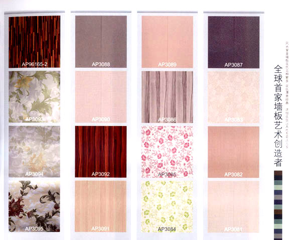 常州愛普裝飾材料有限公司位于美麗富饒的江蘇省常州市,是一家專業(yè)從事墻板設(shè)計(jì)與生產(chǎn)的企業(yè)。年生產(chǎn)墻板300萬平方米。"愛普墻板"是我公司生產(chǎn)的一種新型墻面裝飾材料,產(chǎn)品由人造金剛石耐磨層、三聚氰胺裝飾紙、EO級HDF材料、高檔防潮平衡紙,采用先進(jìn)的德國生產(chǎn)設(shè)備,通過一流的生產(chǎn)工藝--一次性熱壓技術(shù)壓貼成型。具有環(huán)保、耐磨、防刮擦、防潮、阻燃、隔音、保溫、抗沖擊、抗污等優(yōu)點(diǎn)。經(jīng)中華人民共和國專利認(rèn)定為 專利產(chǎn)品(專利號:ZL200820127448.X),為國際首創(chuàng),其知識產(chǎn)權(quán)受國家法律保護(hù)。