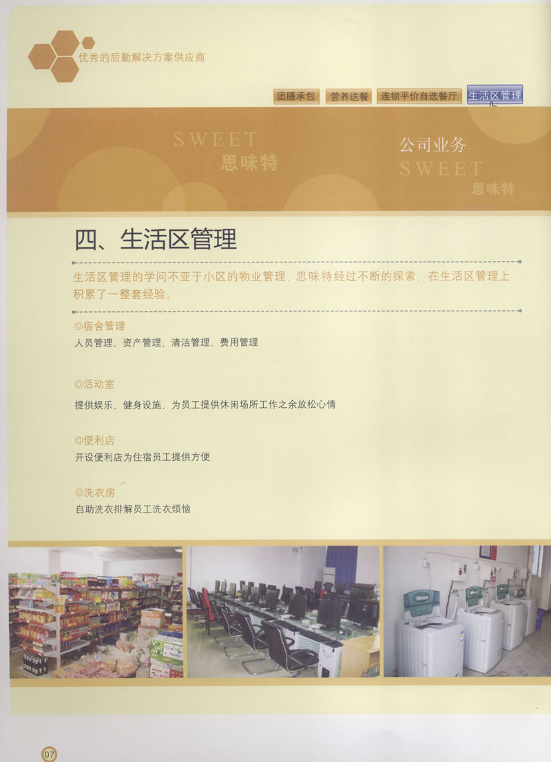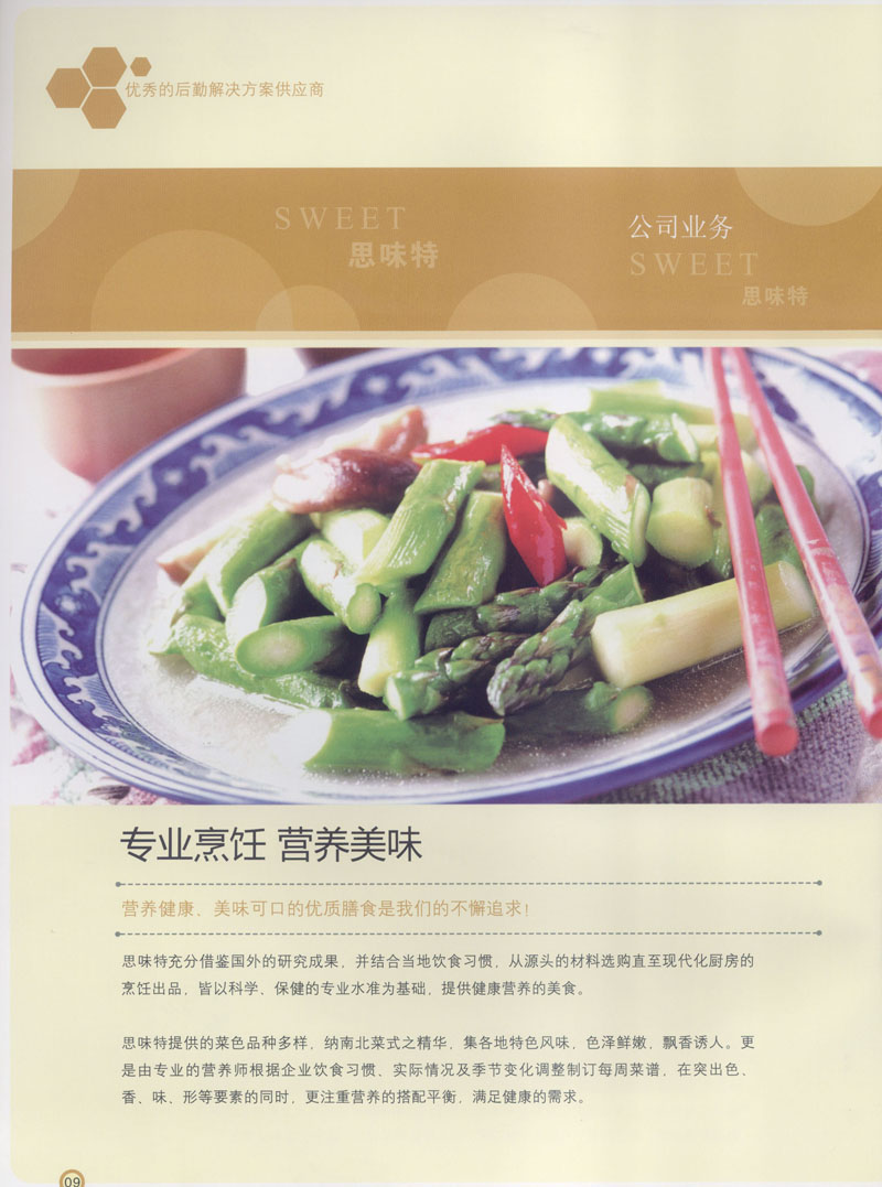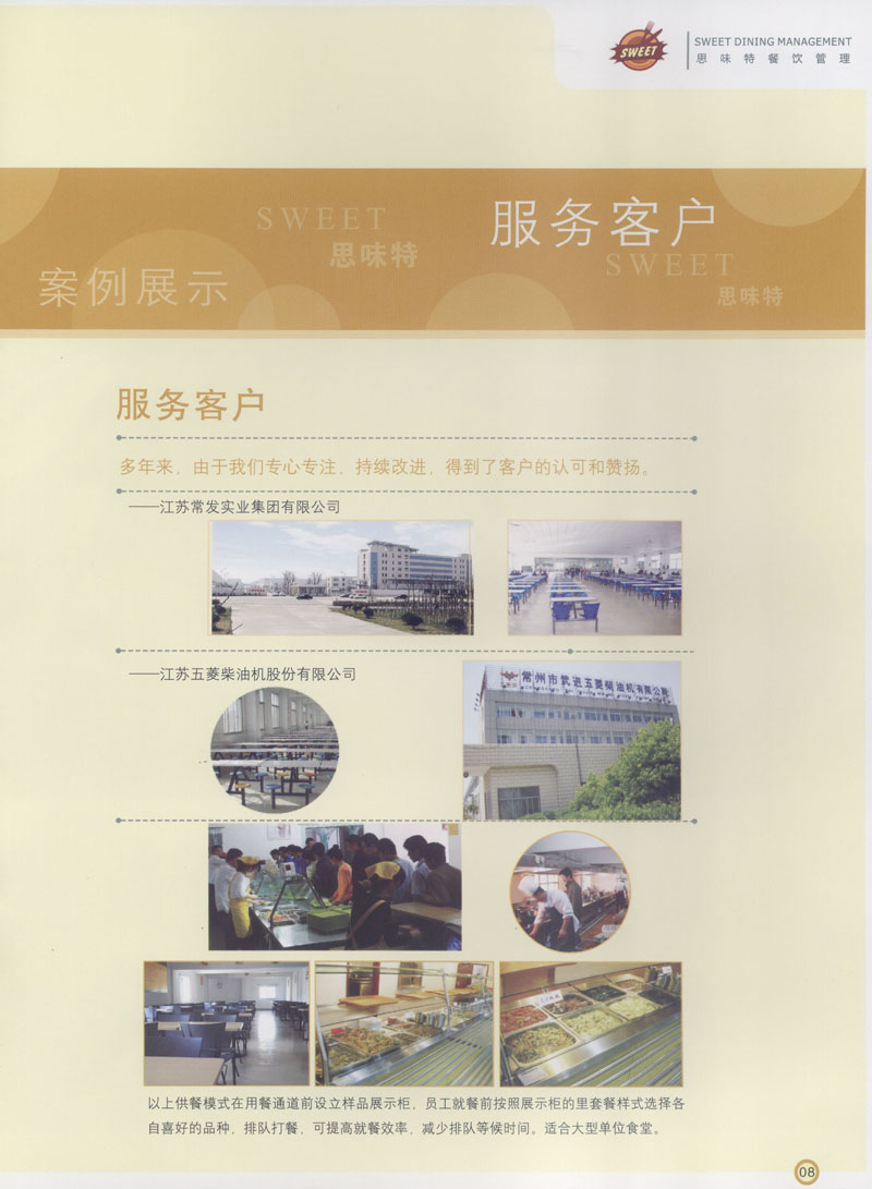 常州市思味特餐飲有限公司是一家專(zhuān)業(yè)從事企事業(yè)后勤服務(wù)的有限責(zé)任公司,公司從承包食堂起步,逐漸發(fā)展為經(jīng)營(yíng)團(tuán)膳承包、營(yíng)養(yǎng)送餐、生活區(qū)管理、連鎖餐廳的綜合型企業(yè)。2008年公司斥資100萬(wàn)元,在常州興建了可以同時(shí)提供3000餐膳食的中央廚房,重點(diǎn)打造“和美客”后勤服務(wù)品牌,全力為企事業(yè)單位解決后勤后顧之憂(yōu)。 到目前為止,我們合作成功的企事業(yè)單位超過(guò)50多家,服務(wù)人數(shù)突破15萬(wàn),合作單位包括國(guó)家機(jī)關(guān)、國(guó)有企業(yè)、三資企業(yè)、民營(yíng)企業(yè)、學(xué)校、醫(yī)院等,其中不乏國(guó)際知名品牌公司。 和美客愿為更多的國(guó)內(nèi)外企事業(yè)單位及機(jī)關(guān)團(tuán)體分憂(yōu)解難,從廚房設(shè)計(jì)、菜品配送、團(tuán)膳承包、到生活區(qū)管理等提供全方位的服務(wù)。