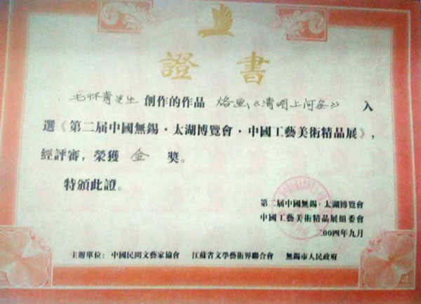 毛懷青,江蘇常州市武進(jìn)人。 中國(guó)工藝美術(shù)學(xué)會(huì)會(huì)員,常州市中國(guó)烙畫(huà)研究會(huì)副會(huì)長(zhǎng),常州市文博鑒賞協(xié)會(huì)理事,非物質(zhì)文化遺產(chǎn)烙畫(huà)傳承人。高級(jí)工藝美術(shù)師。 年輕時(shí)學(xué)習(xí)國(guó)畫(huà)、油畫(huà)中年蔓現(xiàn)掌州咯畫(huà)源遠(yuǎn)流長(zhǎng)、歷史悠久,有著其它美術(shù)門(mén)類不具備的藝術(shù)風(fēng)格與特色。可謂是工藝美術(shù)中的一朵十分亮麗的藝術(shù)奇葩,是我民族先人給我們留下的一份不可多得十分珍貴的一份文化遺產(chǎn)。為弘揚(yáng)與發(fā)展這份優(yōu)秀文化遺產(chǎn),我從此下定決心研究烙畫(huà),愿付出一份力量為振興烙畫(huà)事業(yè)做出貢獻(xiàn)。至今已潛心研究幾十年,取得了可喜的成績(jī),被業(yè)界公認(rèn),社會(huì)關(guān)注與認(rèn)可。有“江南烙畫(huà)第一筆”之美譽(yù)。 近年來(lái),創(chuàng)作的烙畫(huà)作品分別獲得過(guò)全國(guó)、省市級(jí)的金、銀、銅獎(jiǎng)多次。中央電視臺(tái)曾兩次播放過(guò)本人的烙畫(huà)作品,江蘇電視臺(tái)、常州電視臺(tái)也曾多次播放過(guò)本人的作品與烙畫(huà)藝術(shù)生涯,揚(yáng)子晚報(bào)、常州日?qǐng)?bào)、常州晚報(bào)也曾多次報(bào)導(dǎo)過(guò)本人的烙畫(huà)作品,出版物有三種版本都能查閱到介紹本的烙畫(huà)從藝生涯與藝術(shù)業(yè)績(jī)。