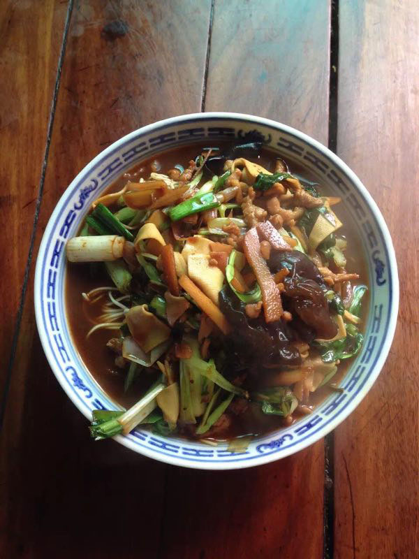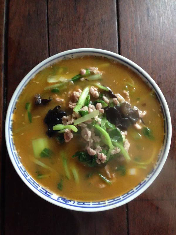 和一般面館事先燒制好澆頭,放在盆里供客人選擇不同,青城面館的澆頭都是一份份現(xiàn)炒的,特別講究食材的新鮮。就拿暢銷的肉絲蔬菜紅湯面來(lái)說(shuō),要先起猛火,把肉絲、木耳、蘑菇、青菜等食材