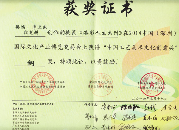 公司榮譽(yù)介紹: “2009年常州市旅游商品創(chuàng)新設(shè)計(jì)大賽”,“覽盡千荷”綠檀雕刻梳榮獲三等獎(jiǎng); “2011年常州市旅游商品創(chuàng)新設(shè)計(jì)大賽”,“彩印工藝梳-我們的年代(80)”榮獲二等獎(jiǎng)。 “2011年中國包裝創(chuàng)意設(shè)計(jì)大賽“,虞美人彩印梳篦系列包裝獲得一等獎(jiǎng); “2011年中國包裝創(chuàng)意設(shè)計(jì)大賽”,虞美人筷子系列包裝獲得三等獎(jiǎng); “2011創(chuàng)意中國.第五屆設(shè)計(jì)藝術(shù)大獎(jiǎng)賽”,虞美人系列包裝獲得三等獎(jiǎng); “2011首屆中國(無錫)國際文化藝術(shù)博覽會(huì)”,漆藝對(duì)梳《喜玫瑰》獲得“藝博杯“銅獎(jiǎng)。 “第十三屆中國工藝美術(shù)大師作品暨國際藝術(shù)精品博覽會(huì)”, 漆藝梳《報(bào)喜鳥》榮獲2012“儒士儒家•百花杯”中國工藝美術(shù)精品獎(jiǎng)優(yōu)秀獎(jiǎng) “第十三屆中國工藝美術(shù)大師作品暨國際藝術(shù)精品博覽會(huì)”, 虞美人《渾然天成》榮獲2012“儒士儒家•百花杯”中國工藝美術(shù)精品獎(jiǎng)金獎(jiǎng) “2012江蘇省工藝美術(shù)精品大獎(jiǎng)賽”,虞美人《S型梳》喜獲“藝博杯”銀獎(jiǎng) “第十四屆中國工藝美術(shù)大師作品暨國際藝術(shù)精品博覽會(huì)”, 虞美人工藝梳《新型十二星座梳》榮獲2013“國信•百花杯”中國工藝美術(shù)精品獎(jiǎng)優(yōu)秀獎(jiǎng) “2013【藝博杯】江蘇省工藝美術(shù)精品大獎(jiǎng)賽”,虞美人《萬事如意系列》喜獲“藝博杯”銀獎(jiǎng) “2013江蘇省工藝美術(shù)新人新作成果展作品大獎(jiǎng)賽”,虞美人《壺(福)的藝術(shù)》喜獲“藝博杯”入圍獎(jiǎng) 2013年度江蘇省“蘇商領(lǐng)袖峰會(huì)”,常州市卓尚飾品有限公司榮獲最具成長性企業(yè)獎(jiǎng) 常州市卓尚飾品(虞美人)有限公司總經(jīng)理李衛(wèi)東榮獲“常州創(chuàng)意產(chǎn)業(yè)協(xié)會(huì)2013年底慈善獎(jiǎng)榮譽(yù)” 常州市卓尚飾品有限公司榮獲薛家鎮(zhèn)人民政府2013年度“創(chuàng)新創(chuàng)優(yōu)”獎(jiǎng) 常州市卓尚飾品有限公司榮獲薛家鎮(zhèn)人民政府2013年度“銷售業(yè)績”獎(jiǎng) 2014中國(深圳)國際文化產(chǎn)業(yè)博覽交易會(huì),劉燕西、李衛(wèi)東、段筆耕<十二星座系列>獲得“中國工藝美術(shù)文化創(chuàng)意獎(jiǎng)”銀獎(jiǎng) 2014中國(深圳)國際文化產(chǎn)業(yè)博覽交易會(huì),徐德鴻、李衛(wèi)東、段筆耕《漆彩人生系列》獲得“中國工藝美術(shù)文化創(chuàng)意獎(jiǎng)”銅獎(jiǎng) 文化創(chuàng)意大獎(jiǎng)賽“紫金獎(jiǎng)” ,有余(魚)系列梳篦產(chǎn)品獲得了優(yōu)秀獎(jiǎng) 2014吟飛杯首屆常州文化創(chuàng)意和設(shè)計(jì)大賽,虞美人有余(魚)系列梳篦產(chǎn)品榮獲優(yōu)秀設(shè)計(jì)獎(jiǎng) 2014吟飛杯首屆常州文化創(chuàng)意和設(shè)計(jì)大賽,虞美人“云,月”系列梳篦產(chǎn)品榮獲優(yōu)秀設(shè)計(jì)獎(jiǎng) 2014藝博杯江蘇省工藝美術(shù)精品大獎(jiǎng)賽,虞美人《梳篦:酒醉的探戈》喜獲銀獎(jiǎng) 2014“中國原創(chuàng)•百花杯”中國工藝美術(shù)精品大獎(jiǎng)賽,虞美人《梳篦-江南風(fēng)韻系列》喜獲銀獎(jiǎng) 常州市卓尚飾品有限公司獲“2014年常州市電子商務(wù)協(xié)會(huì)2014年度優(yōu)秀會(huì)員單位” 2014“虞美人”成為常州市知名商標(biāo)。