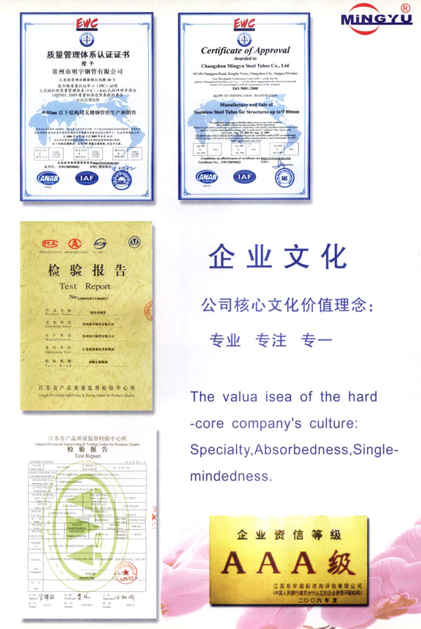 常州市明宇鋼管有限公司位于江南水鄉(xiāng)常州與無錫之間,緊臨滬寧高速,312國道,沿江高速,錫宜高速,京杭大運河,交通極為方便。 公司創(chuàng)建于1992年,固定資產2500萬元,車間面積15000平方米,現有職工220人,技術員30人,穿孔機組外徑40-80兩套,冷拔機組10T-80T八套,輥底式熱處理爐一套,形成年產30000噸各類無縫鋼管的生產能力。另有半自動鋼鋸切割機八臺,儀表倒角機18臺,電鍍鋅槽3條,形成從切割、倒角、電鍍的鋼管深加工能力,年產紡機牽伸管、紗管、編織機筒管1000萬支的生產能力。 集行業(yè)之精華,全新的設備,完備的檢測手段,嚴格的管理措施,良好的服務宗旨,高素質的員工隊伍,在多年的生產實踐經驗基礎上,保障了出廠產品的質量,以質量求生存,以信譽求市場,以科技求發(fā)展,以價格求客戶的經營理念,竭誠為社會各界用戶提供一流服務。
