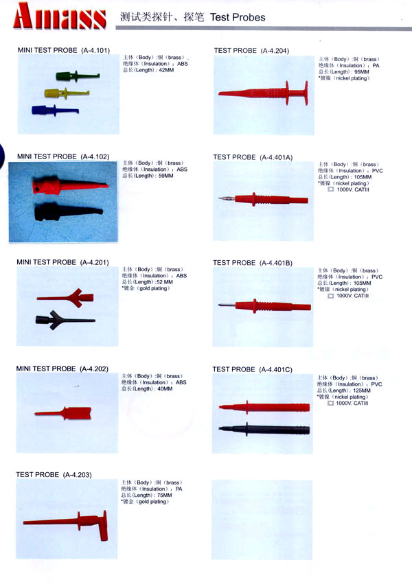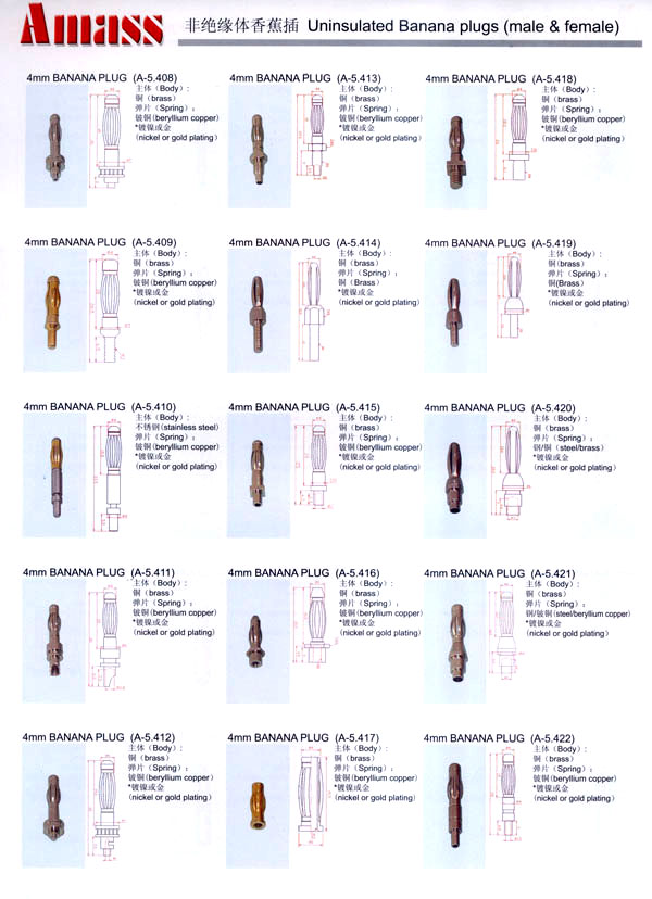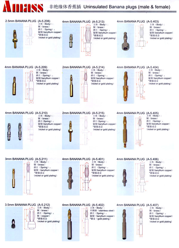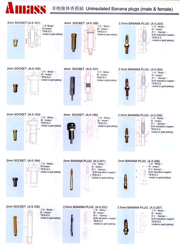 本公司專業(yè)生產(chǎn)各類香蕉插頭,香蕉插座,接線柱,電瓶夾,鱷魚夾,測試導線,測試筆等。產(chǎn)品分2mm/2.5mm/3mm/3.5mm/4mm五大系列,百余種款式, 各種香蕉插廣泛用于儀器、儀表、電力測試、教學、玩具,視聽設備、醫(yī)療儀器,保健產(chǎn)品等領域。公司技術力量雄厚,生產(chǎn)工藝先進,產(chǎn)品遠銷港、臺、歐美,并與飛利浦等國際品牌配套。公司本著精益求精的理念,歡迎新老客戶光臨。 我們擁有資深的工程師和豐富的電子產(chǎn)品銷售經(jīng)驗,專業(yè)生產(chǎn)各類電子接插件產(chǎn)品。 香蕉插頭,香蕉插座,電瓶夾,鱷魚夾等品種齊全、 質(zhì)量可靠,致力服務于通訊、數(shù)據(jù)通信、消費類電子產(chǎn)品、計算機和計算機外圍設備以及工業(yè)應用等領域,能給客戶提供全面采購解決方案。 我們秉承穩(wěn)健作風、誠實經(jīng)營、合理價格、完善服務的宗旨,在全體客戶的支持下,公司不斷創(chuàng)新進取,業(yè)績蒸蒸日上,已與數(shù)十家電子零件制造商及其分支機構(gòu)建立密切合作關系,在國內(nèi)擁有數(shù)百家固定客戶。