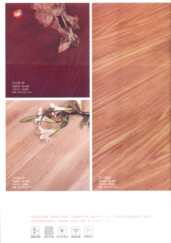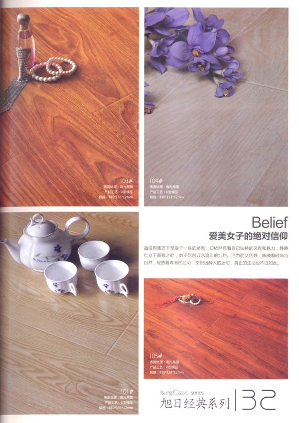 公司旗下“霞光.旭日”品牌地板系列由旭日皇家、旭日經(jīng)典、旭日戀家、至尊奢華、巧奪天工、水晶陶瓷等幾個(gè)系列構(gòu)成,配有專職質(zhì)量檢驗(yàn)人員,嚴(yán)把產(chǎn)品質(zhì)量關(guān),不斷完善產(chǎn)品質(zhì)量體系、監(jiān)控管理體系。公司對(duì)客戶需求全面、科學(xué)、準(zhǔn)確地把握,確保對(duì)客戶市場適時(shí)高效反應(yīng)。一流的設(shè)備、精心的選材、完美的工藝以及對(duì)產(chǎn)品品味不倦的追求,令奔公司產(chǎn)品獨(dú)樹一幟。