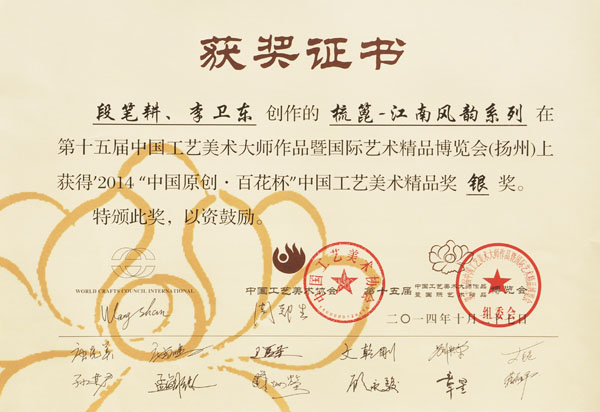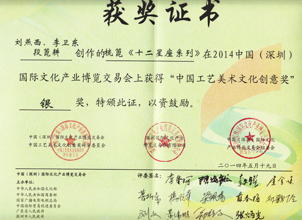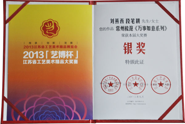 公司榮譽介紹: “2009年常州市旅游商品創(chuàng)新設計大賽”,“覽盡千荷”綠檀雕刻梳榮獲三等獎; “2011年常州市旅游商品創(chuàng)新設計大賽”,“彩印工藝梳-我們的年代(80)”榮獲二等獎。 “2011年中國包裝創(chuàng)意設計大賽“,虞美人彩印梳篦系列包裝獲得一等獎; “2011年中國包裝創(chuàng)意設計大賽”,虞美人筷子系列包裝獲得三等獎; “2011創(chuàng)意中國.第五屆設計藝術大獎賽”,虞美人系列包裝獲得三等獎; “2011首屆中國(無錫)國際文化藝術博覽會”,漆藝對梳《喜玫瑰》獲得“藝博杯“銅獎。 “第十三屆中國工藝美術大師作品暨國際藝術精品博覽會”, 漆藝梳《報喜鳥》榮獲2012“儒士儒家•百花杯”中國工藝美術精品獎優(yōu)秀獎 “第十三屆中國工藝美術大師作品暨國際藝術精品博覽會”, 虞美人《渾然天成》榮獲2012“儒士儒家•百花杯”中國工藝美術精品獎金獎 “2012江蘇省工藝美術精品大獎賽”,虞美人《S型梳》喜獲“藝博杯”銀獎 “第十四屆中國工藝美術大師作品暨國際藝術精品博覽會”, 虞美人工藝梳《新型十二星座梳》榮獲2013“國信•百花杯”中國工藝美術精品獎優(yōu)秀獎 “2013【藝博杯】江蘇省工藝美術精品大獎賽”,虞美人《萬事如意系列》喜獲“藝博杯”銀獎 “2013江蘇省工藝美術新人新作成果展作品大獎賽”,虞美人《壺(福)的藝術》喜獲“藝博杯”入圍獎 2013年度江蘇省“蘇商領袖峰會”,常州市卓尚飾品有限公司榮獲最具成長性企業(yè)獎 常州市卓尚飾品(虞美人)有限公司總經理李衛(wèi)東榮獲“常州創(chuàng)意產業(yè)協(xié)會2013年底慈善獎榮譽” 常州市卓尚飾品有限公司榮獲薛家鎮(zhèn)人民政府2013年度“創(chuàng)新創(chuàng)優(yōu)”獎 常州市卓尚飾品有限公司榮獲薛家鎮(zhèn)人民政府2013年度“銷售業(yè)績”獎 2014中國(深圳)國際文化產業(yè)博覽交易會,劉燕西、李衛(wèi)東、段筆耕<十二星座系列>獲得“中國工藝美術文化創(chuàng)意獎”銀獎 2014中國(深圳)國際文化產業(yè)博覽交易會,徐德鴻、李衛(wèi)東、段筆耕《漆彩人生系列》獲得“中國工藝美術文化創(chuàng)意獎”銅獎 文化創(chuàng)意大獎賽“紫金獎” ,有余(魚)系列梳篦產品獲得了優(yōu)秀獎 2014吟飛杯首屆常州文化創(chuàng)意和設計大賽,虞美人有余(魚)系列梳篦產品榮獲優(yōu)秀設計獎 2014吟飛杯首屆常州文化創(chuàng)意和設計大賽,虞美人“云,月”系列梳篦產品榮獲優(yōu)秀設計獎 2014藝博杯江蘇省工藝美術精品大獎賽,虞美人《梳篦:酒醉的探戈》喜獲銀獎 2014“中國原創(chuàng)•百花杯”中國工藝美術精品大獎賽,虞美人《梳篦-江南風韻系列》喜獲銀獎 常州市卓尚飾品有限公司獲“2014年常州市電子商務協(xié)會2014年度優(yōu)秀會員單位” 2014“虞美人”成為常州市知名商標。