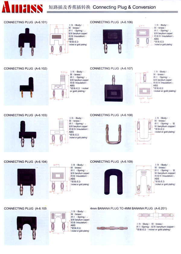 本公司專業(yè)生產(chǎn)各類香蕉插頭,香蕉插座,接線柱,電瓶夾,鱷魚夾,測試導(dǎo)線,測試筆等。產(chǎn)品分2mm/2.5mm/3mm/3.5mm/4mm五大系列,百余種款式, 各種香蕉插廣泛用于儀器、儀表、電力測試、教學(xué)、玩具,視聽設(shè)備、醫(yī)療儀器,保健產(chǎn)品等領(lǐng)域。公司技術(shù)力量雄厚,生產(chǎn)工藝先進(jìn),產(chǎn)品遠(yuǎn)銷港、臺、歐美,并與飛利浦等國際品牌配套。公司本著精益求精的理念,歡迎新老客戶光臨。 我們擁有資深的工程師和豐富的電子產(chǎn)品銷售經(jīng)驗,專業(yè)生產(chǎn)各類電子接插件產(chǎn)品。 香蕉插頭,香蕉插座,電瓶夾,鱷魚夾等品種齊全、 質(zhì)量可靠,致力服務(wù)于通訊、數(shù)據(jù)通信、消費類電子產(chǎn)品、計算機和計算機外圍設(shè)備以及工業(yè)應(yīng)用等領(lǐng)域,能給客戶提供全面采購解決方案。 我們秉承穩(wěn)健作風(fēng)、誠實經(jīng)營、合理價格、完善服務(wù)的宗旨,在全體客戶的支持下,公司不斷創(chuàng)新進(jìn)取,業(yè)績蒸蒸日上,已與數(shù)十家電子零件制造商及其分支機構(gòu)建立密切合作關(guān)系,在國內(nèi)擁有數(shù)百家固定客戶。