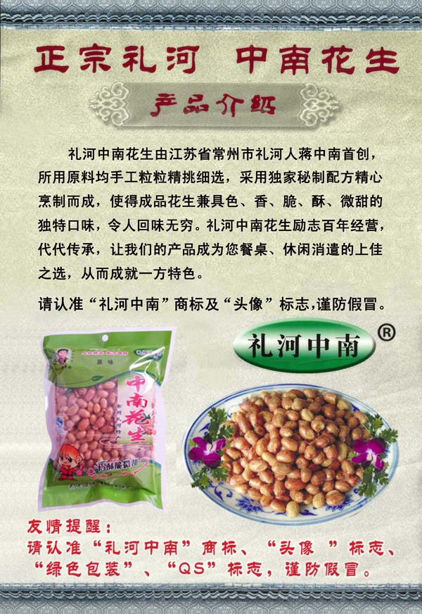 武進區(qū)牛塘中南食品廠的是由原“禮河中南”花生發(fā)展而成。"禮河中南"花生由常州禮河人蔣中南首創(chuàng)。所采用的花生,選用優(yōu)質的產地,經(jīng)過人工精心挑選,把不規(guī)則的粒子去掉,加上獨家的配方和精工制作,使花生香、酥、脆、微甜。獨特的口味,令人吃了回味無窮,在常武地區(qū)享有盛譽、暢銷不衰。 隨著“禮河中南“花生在常武地區(qū)的暢銷,企業(yè)不斷的發(fā)展壯大,逐漸發(fā)展成為一個專業(yè)生產加工油炸花生的公司,擁有完整、科學的質量管理體系。武進牛塘中南花生食品廠設備齊全、環(huán)境干凈整潔、資質齊全,企業(yè)的誠信、實力和產品質量獲得業(yè)界的認可。 正宗的中南花生為綠色包裝,包裝上有“禮河中南”花生創(chuàng)始人蔣中南先生的頭像以及QS生產許可標志,請廣大客戶認準購買,以防假冒。 歡迎各界朋友蒞臨參觀、指導和業(yè)務洽談。 制造商:常州市武進區(qū)牛塘中南食品廠 銷售店:常州市武進區(qū)禮河聚新家園商業(yè)街12-8號 常州市武進區(qū)湖塘鎮(zhèn)東方路53號(陸家橋西側)