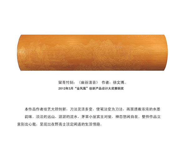 徐博(藝名文博),1973年生,江蘇武進(jìn)人,江蘇省省名人,高級工藝美術(shù)師,常州市留青竹刻非遺傳承人,常州工藝美術(shù)家協(xié)會理事,被譽(yù)為當(dāng)今中國最具創(chuàng)新意識的新銳竹刻家代表,多次獲得國家工藝美術(shù)大獎?釔哿羟嘀窨痰男煳牟┵p竹為樂,以竹詠志,借竹抒懷,悉心探索留青竹刻的藝術(shù)表現(xiàn)。在中國工藝美術(shù)大師蕭劍波的精心指導(dǎo)下,開創(chuàng)留青水墨山水之技法,更好的體現(xiàn)了竹刻淡雅清秀的藝術(shù)風(fēng)格,并不斷汲取書畫、攝影、雕塑等藝術(shù)精華,不斷滋養(yǎng)藝術(shù)情趣,提升擴(kuò)展胸襟人格的同時也逐步形成了其形神兼?zhèn),虛?shí)相生,氣韻生動的藝術(shù)特點(diǎn),作品為眾多的國內(nèi)外收藏家珍藏。
