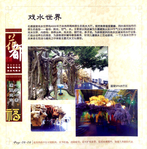 淹城花都溫泉水城孕育天地之精華,悅身、悅?cè)荨傂、悅神。置身其中泉水潺潺,霧氣繚繞、花瓣飄香,恍若仙境。“掬水月在手,弄花香滿衣”,花都溫泉的浪漫與溫潤在這里完美展現(xiàn)。 花都溫泉水城包括洗浴區(qū)、戲水世界、露天溫泉、自助餐廳、生態(tài)房、別墅區(qū)、紅文化房、VIP區(qū)等多種功能區(qū)域,是集溫泉養(yǎng)生、休閑住宿、演藝會務(wù)為—體的休閑度假勝地,給賓客帶來江南小鎮(zhèn)的浪漫水城之旅。 古木新枝畔賓客對酒當(dāng)歌,溪泉石椅旁把茶品啜。 淹城-三勤生態(tài)酒店,這里是一處綠色生態(tài)的美食家園。此地鬼斧神工.奇水異石,和風(fēng)細(xì)雨林中穿過,引百鳥朝來暮歌;這里集生態(tài)餐飲、演藝、中小型會務(wù)為一體,將現(xiàn)代裝飾風(fēng)格和古雅拙樸的自然裝修完美整合;這里聚集大江南北名廚,推出精致綠色美昧佳肴。來到這里,賓客可享田園至美之景,品舌尖至鮮之味,實(shí)乃人生一大樂事。
